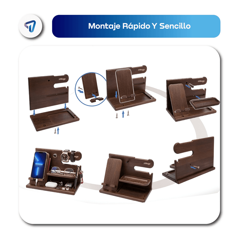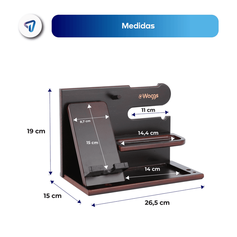 Base organizadora WAGGS ORGESC005, una solución todo en uno en madera de pino natural para mantener tu smartphone, reloj, llaves, billetera y gafas en un mismo lugar. Su diseño rústico y artesanal aporta elegancia y calidez al escritorio o mesa de luz, mientras que su montaje es rápido y sin herramientas. Medidas: 19 × 15 × 26,5 cm. Eco-friendly, con acabado no tóxico y presentación en caja ecológica, es también una opción ideal para regalar. Elegí WAGGS y transformá tu rutina con orden, estilo y funcionalidad