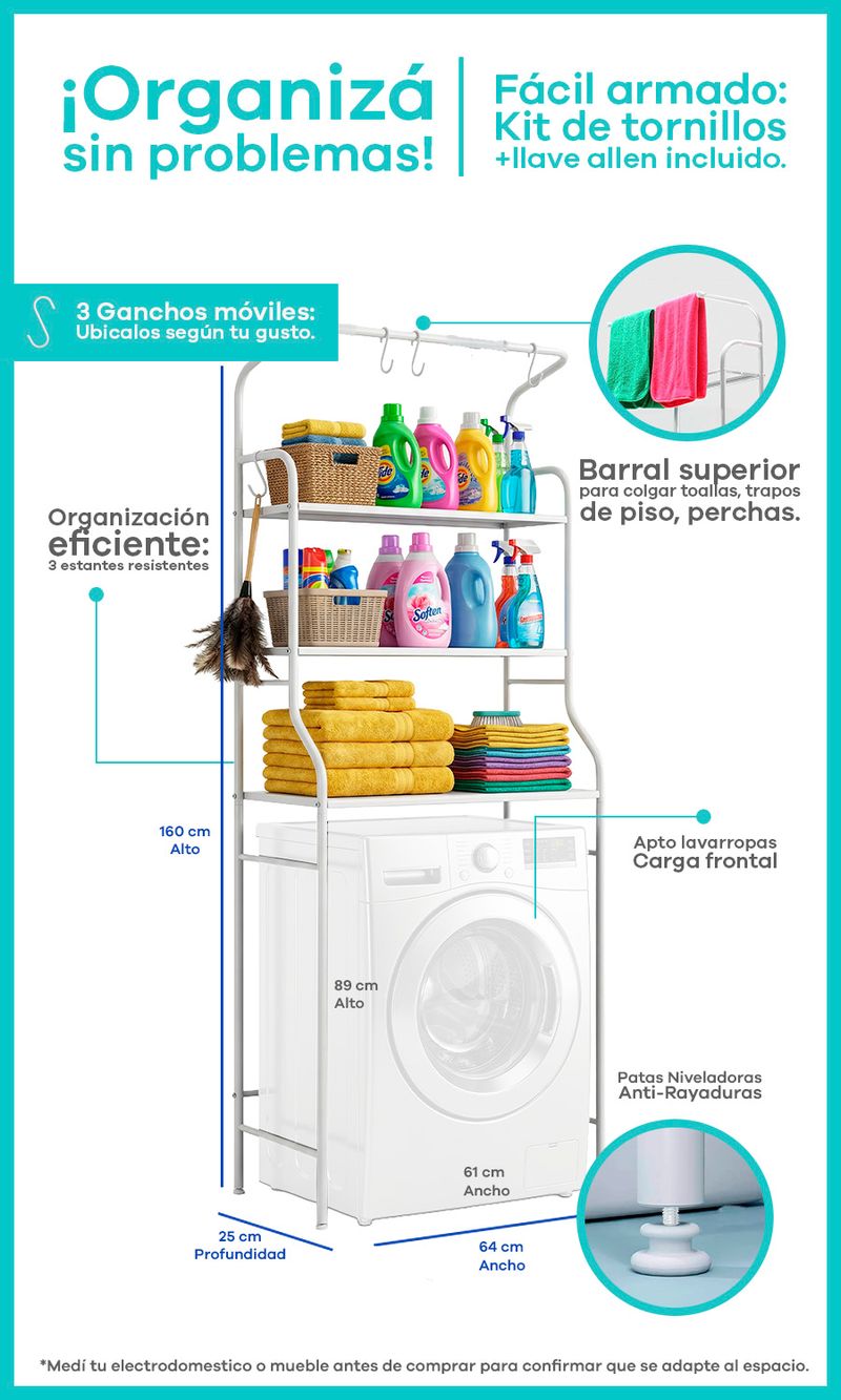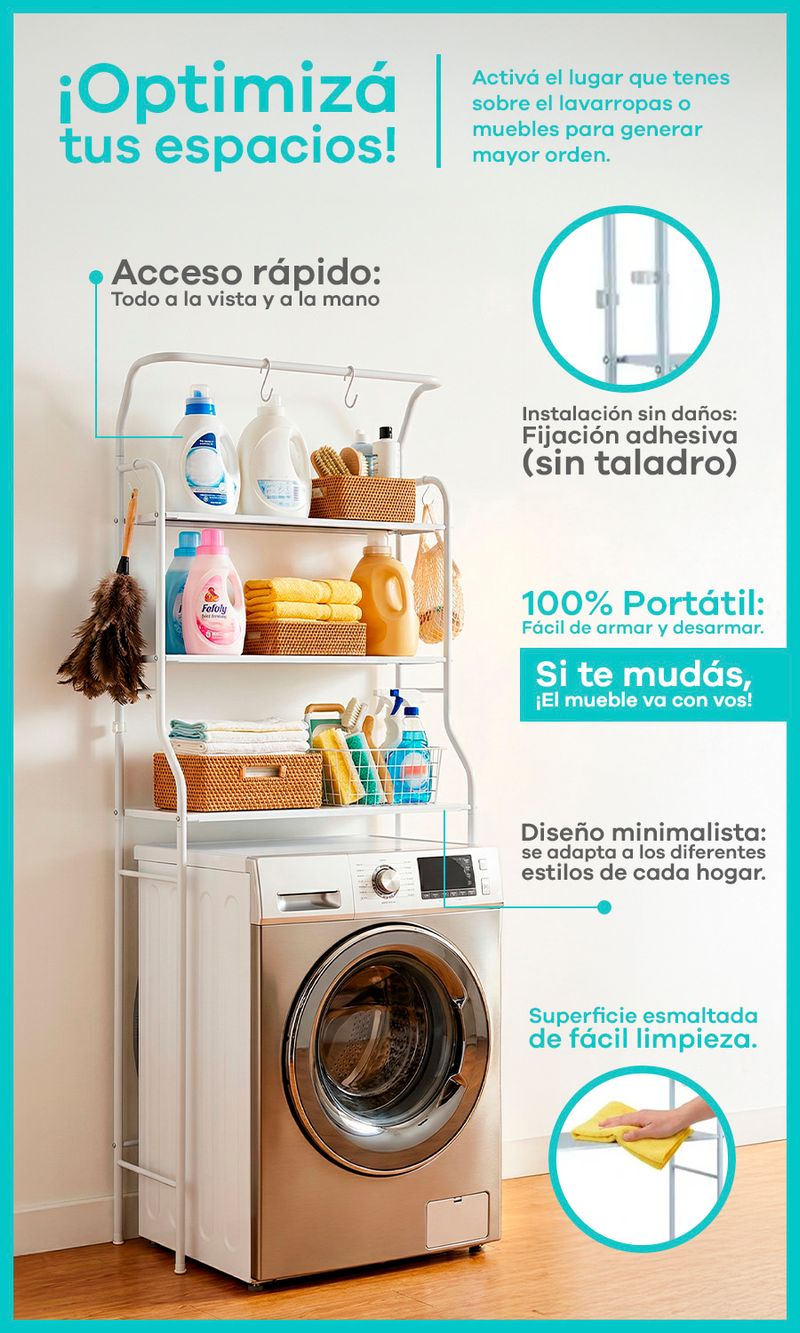Maximiza el espacio de tu lavadero sin perforar paredes ¿Vivís en un departamento o tenés un lavadero pequeño? Este rack organizador es la solución definitiva para mantener tus productos de limpieza, suavizantes y toallas siempre en orden y al alcance de la mano.