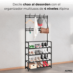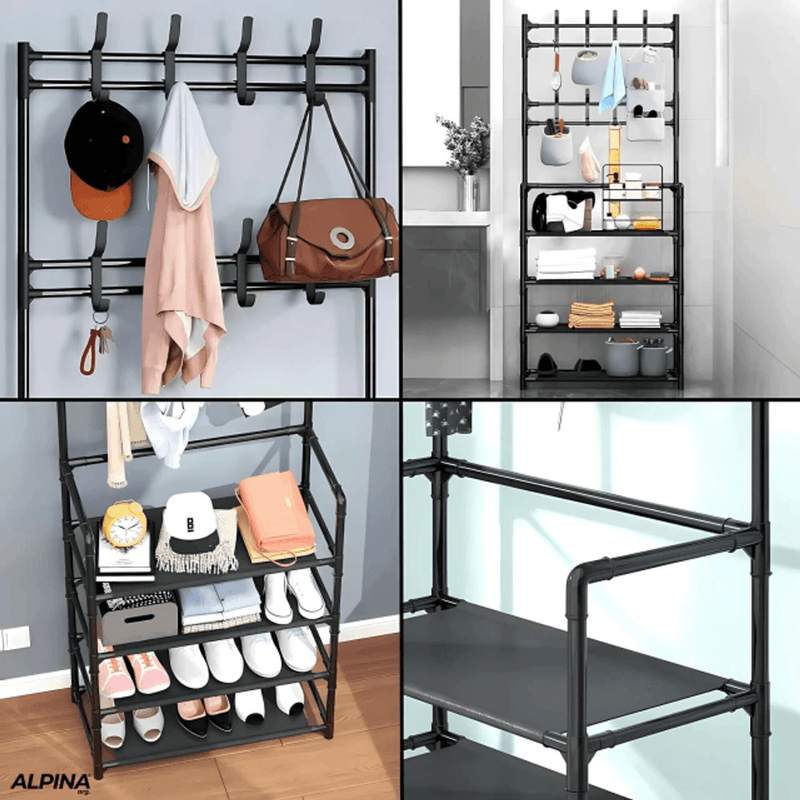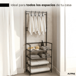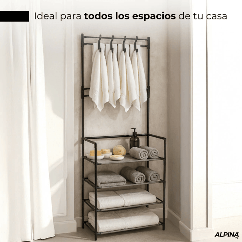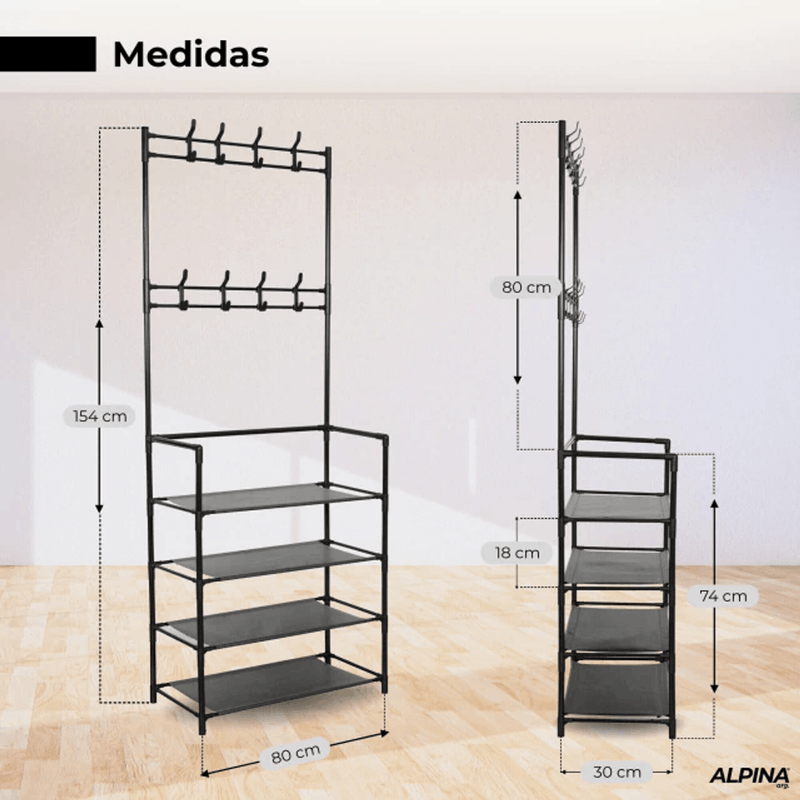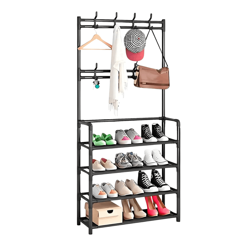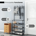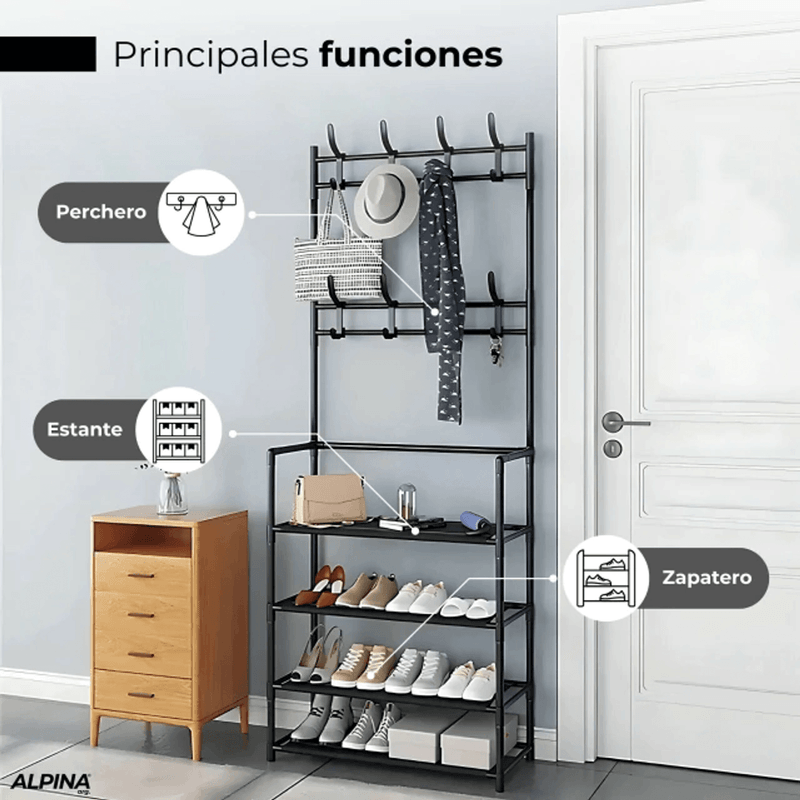 Este organizador multifunción combina perchero y zapatero en una sola estructura práctica, resistente y elegante.