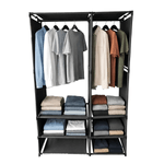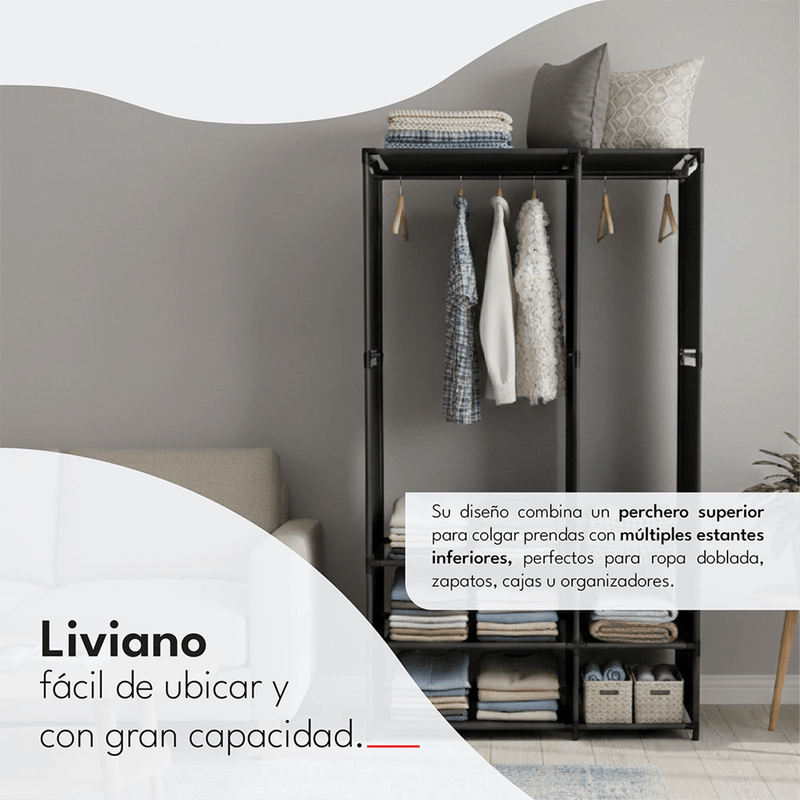 Su diseño combina perchero superior para colgar prendas y múltiples estantes inferiores ideales para ropa doblada, zapatos, cajas u otros accesorios. La estructura metálica de acero al carbono brinda estabilidad y resistencia, mientras que la tela no tejida aporta un acabado prolijo y moderno.