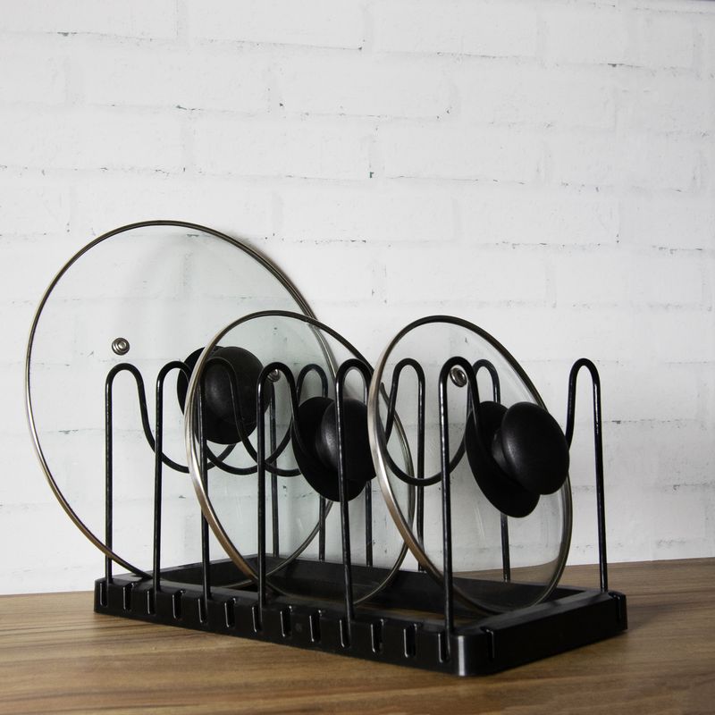 El organizador de tapas y sartenes para gabinetes de cocina Metaltru es la solución perfecta para acomodar artículos, optimizando los espacios entre estantes.