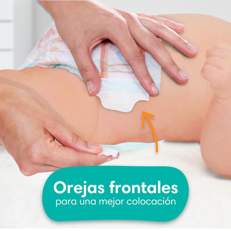 Abra el pañal, coloque el extremo con las orejas debajo de la espalda del bebé y la altura de la cintura. Lleve el otro extremo hacia adelante y pegue las orejas. Verifique el ajuste de los elásticos de las piernas Enrolle el pañal y ciérrelo utilizando las orejas ajustables. Desechar los pañales usados a la basura, nunca en el sanitario.