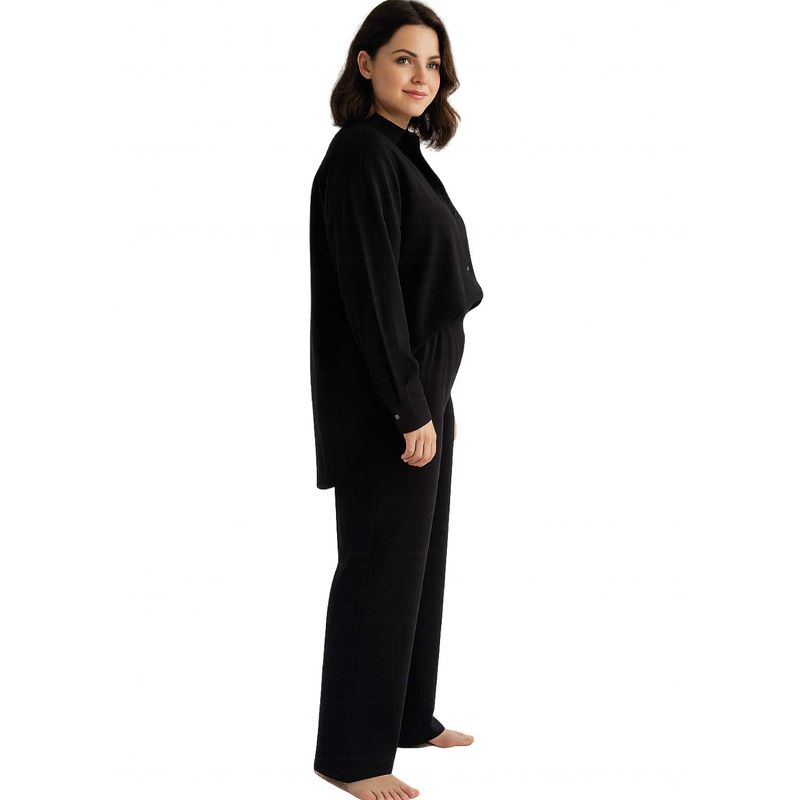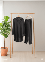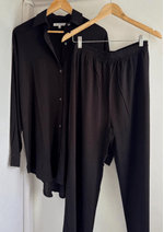 Incluye una camisa amplia y larga con una hermosa caída, ideal para usar abierta o cerrada.