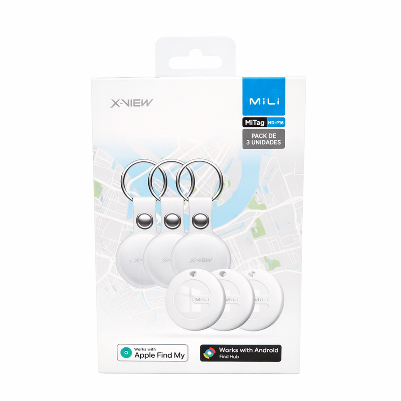 Pack x3 rastreadores Bluetooth X-View MiLi MiTag HD-P16 para localizar llaves, mochilas y objetos. Compatibles con Android y iOS, hasta 100 m de alcance y batería de larga duración. Más ahorro y seguridad.