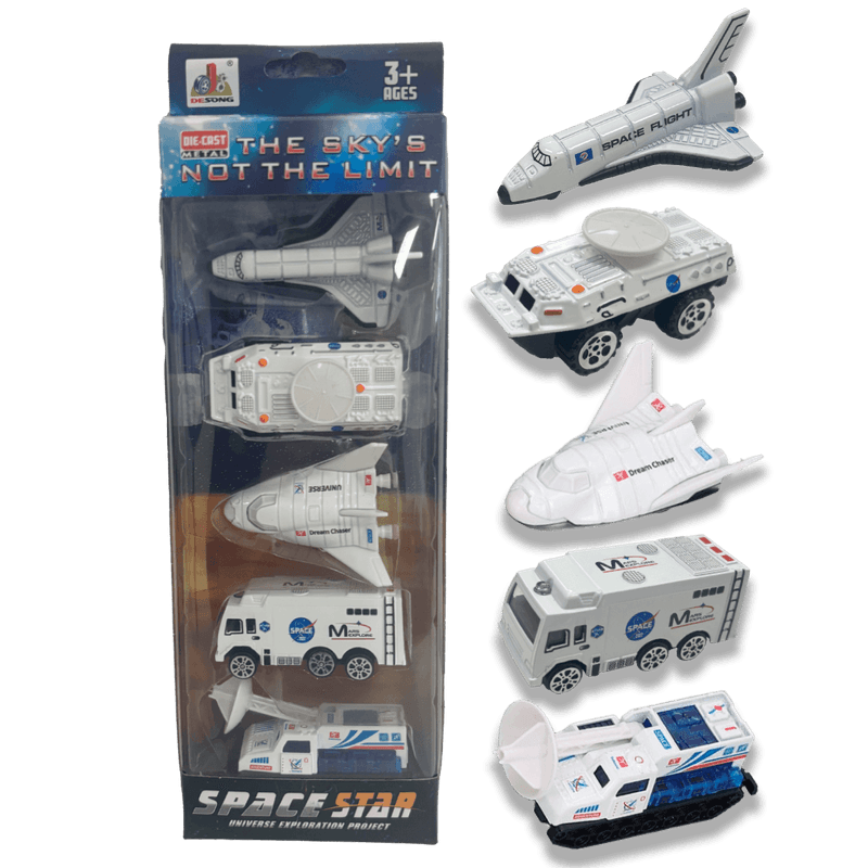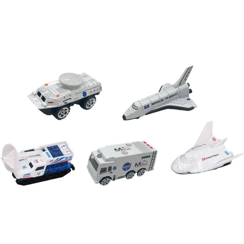 El set incluye 5 vehículos únicos, como transbordadores y exploradores lunares, que inspiran la curiosidad y el deseo de descubrir los secretos del universo. Diseñados con detalles asombrosos, son perfectos para jugar, coleccionar o regalar a los amantes del espacio y la ciencia ficción.
