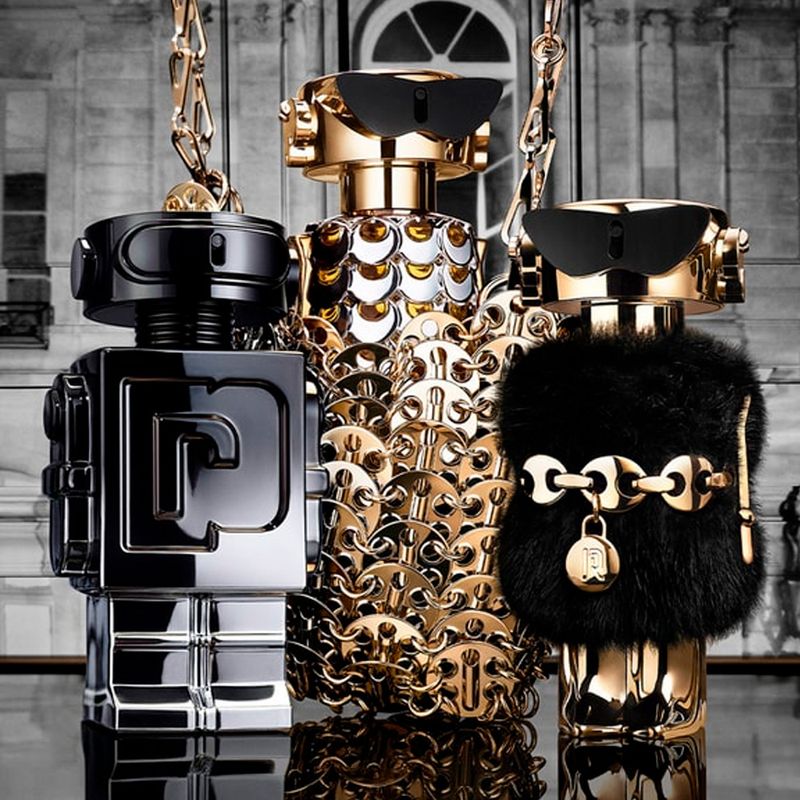 Su icónico frasco en forma de robot, ahora en un elegante degradado plateado a negro, es recargable, combinando diseño futurista con sustentabilidad.