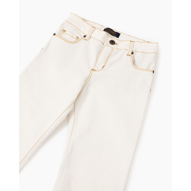 Pantalón cinco bolsillos confeccionado en gabardina confort, con costuras a contra tono. Posee bolsillos traseros con alegorías bordadas. Lleva elástico con ojal interno en cintura hasta el talle 8 inclusive para ajustar mediante botones. Corte recto y ancho en piernas, es un básico de tela super cómoda, largo hasta el talón.