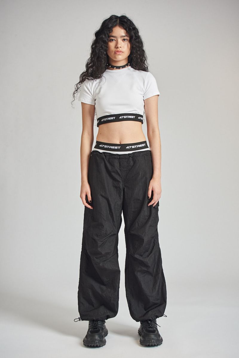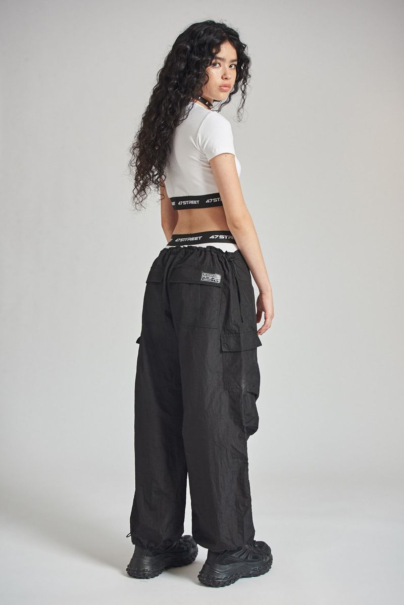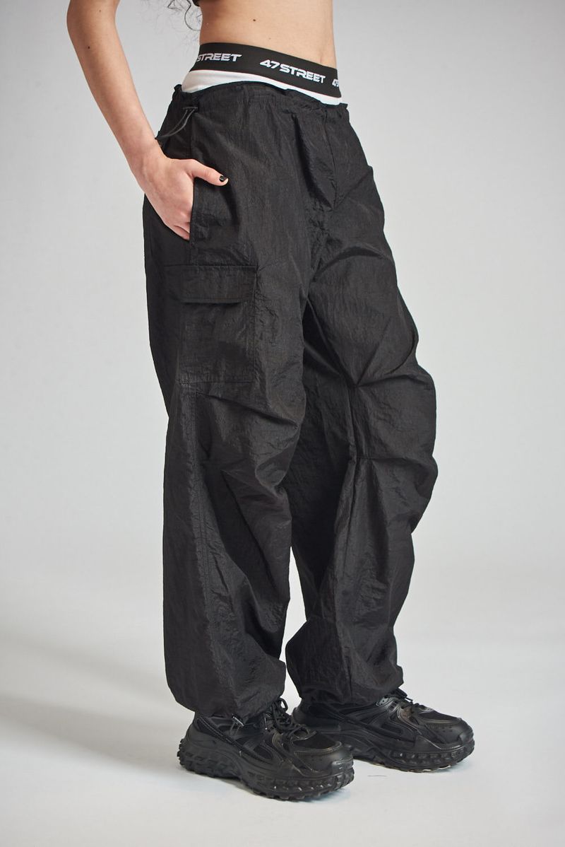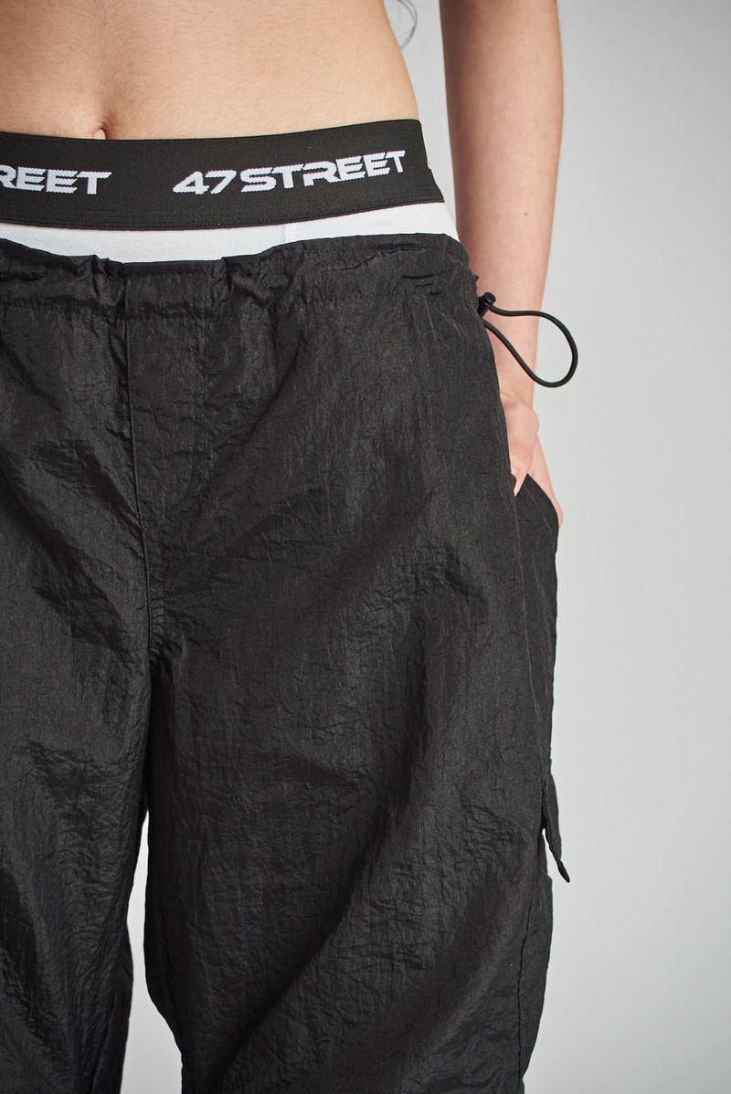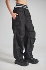 Pantalon tipo parachutte de textil tipo sire crasheado, con bolsillos laterales y bolsillos aplicados con tapa en piernas laterales inferiores y en trasero. Ajuste mediante elástico en cintura y tobillos.