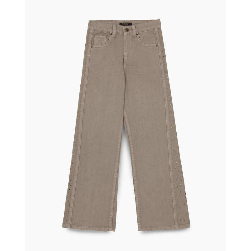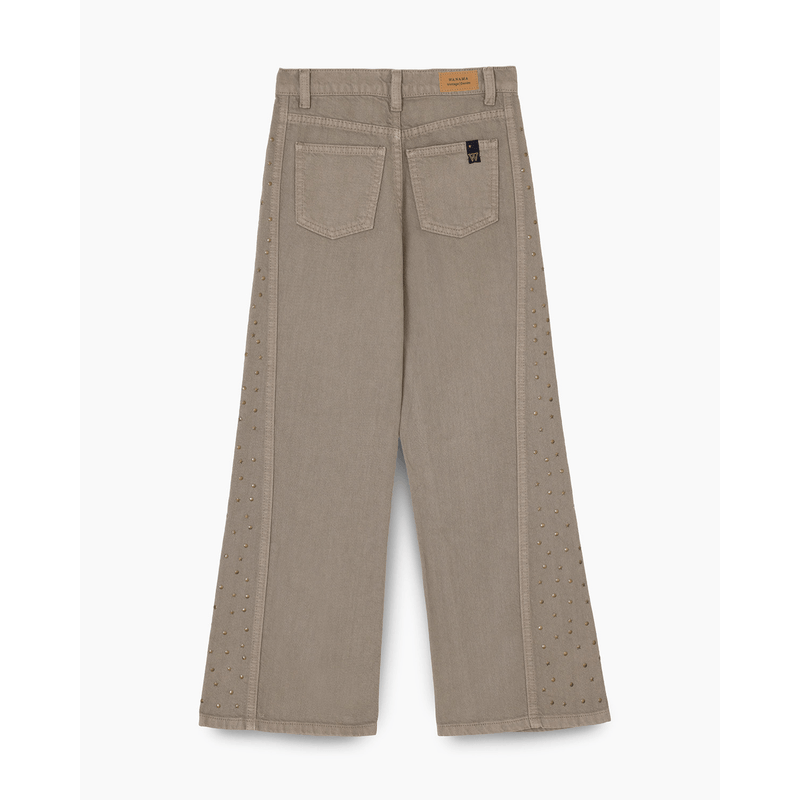 El Pantalón Dalia es un ítem de tendencia total. Confeccionado en gabardina de puro algodón, destaca por su recorte lateral íntegramente decorado con tachas aplicadas que aportan un brillo único.