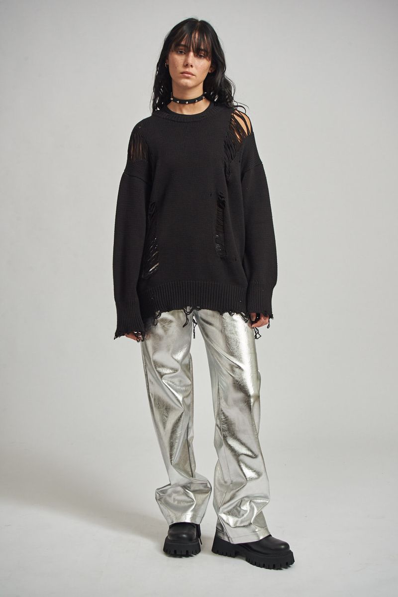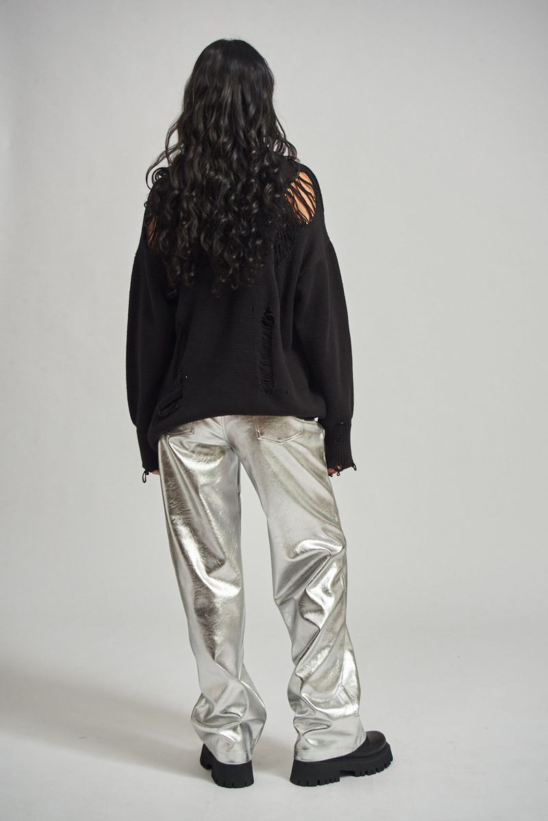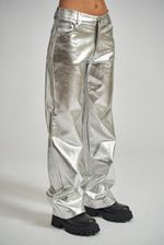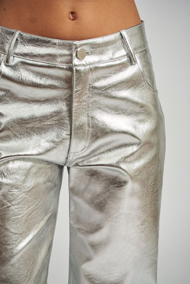 Pantalón corte recto en cuero ecológico metalizado, cinco bolsillos. Avíos marcarios metálicos.