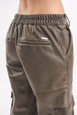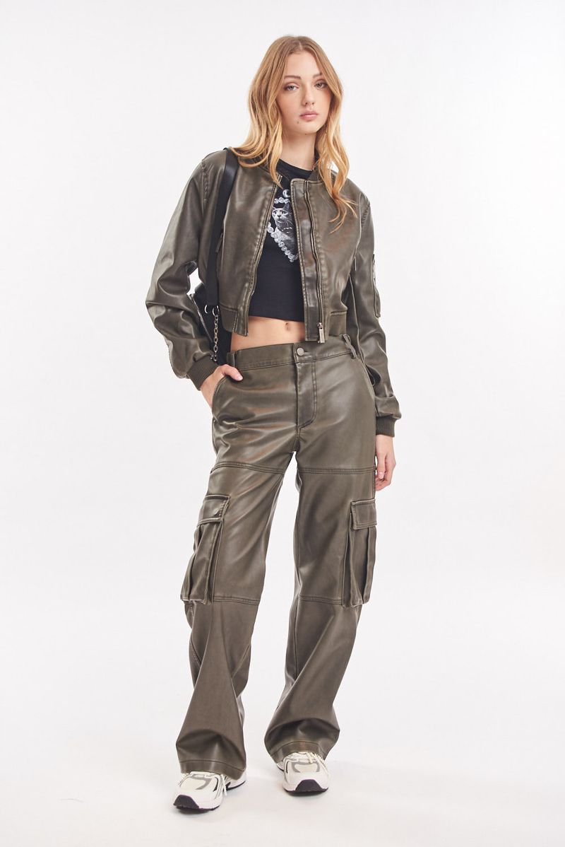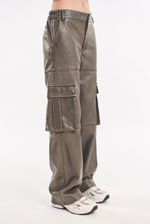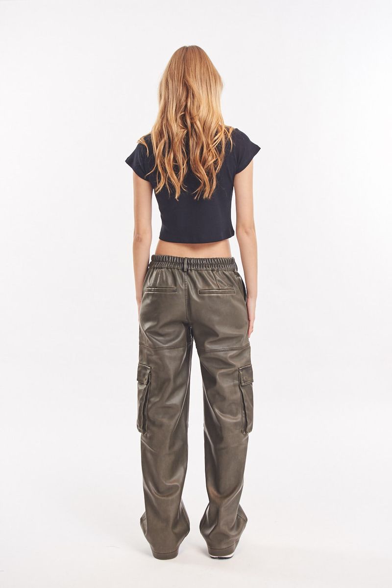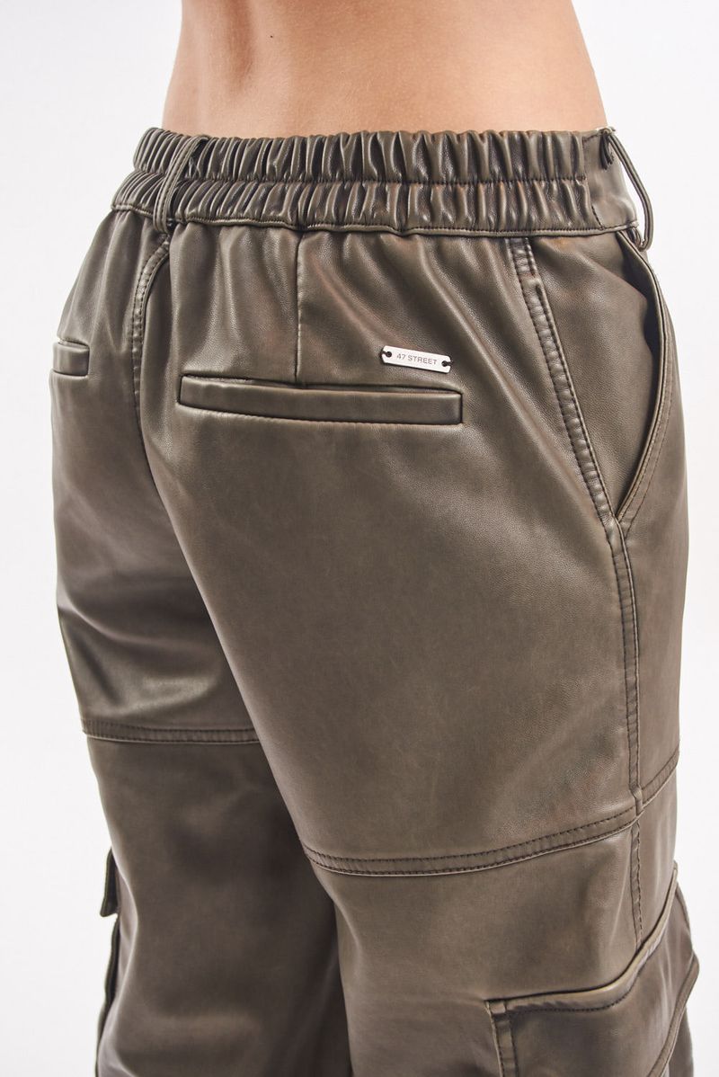 Pantalón de cuero ecológico lavado tiro alto. Múltiples bolsillos. Cintura con elástico, se adapta. Bolsillos con fuelle en laterales de piernas. Bolsillos traseros. Avíos institucionales.
