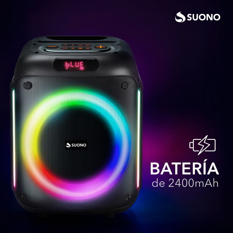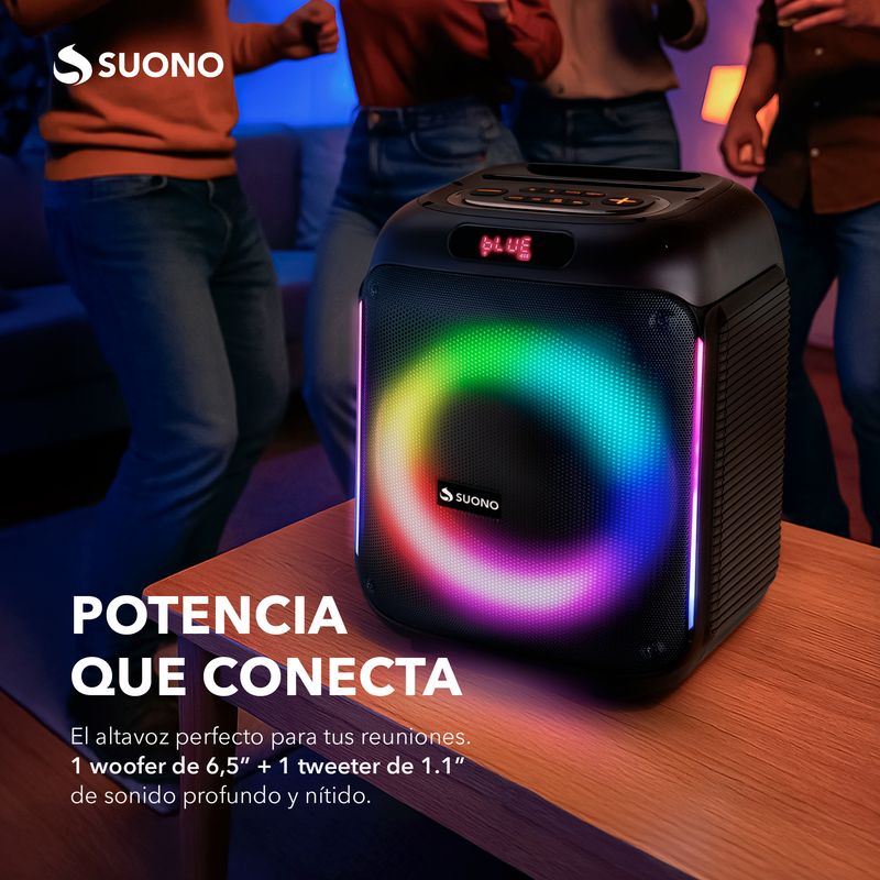 Disfrutá tu música favorita con el Parlante Bluetooth Suono de 6.5”, ideal para reuniones, eventos o uso diario. Compacto, potente y con luces RGB dinámicas, ofrece un sonido envolvente y un diseño moderno que se adapta a cualquier ambiente.