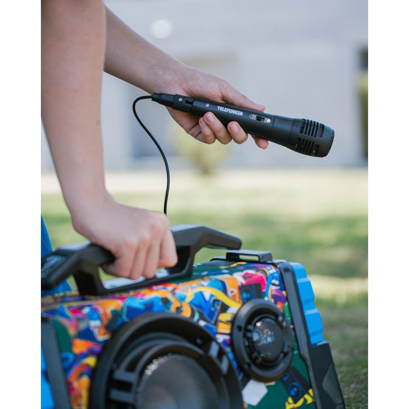 El Telefunken Street 6 también incluye un micrófono y efectos de voz, lo que lo convierte en una excelente opción para karaoke o presentaciones. Las luces LED añaden un toque visual atractivo, creando un ambiente festivo en cualquier ocasión. Su configuración de canales 5.1 garantiza una experiencia de sonido envolvente, ideal para disfrutar de tus canciones favoritas.