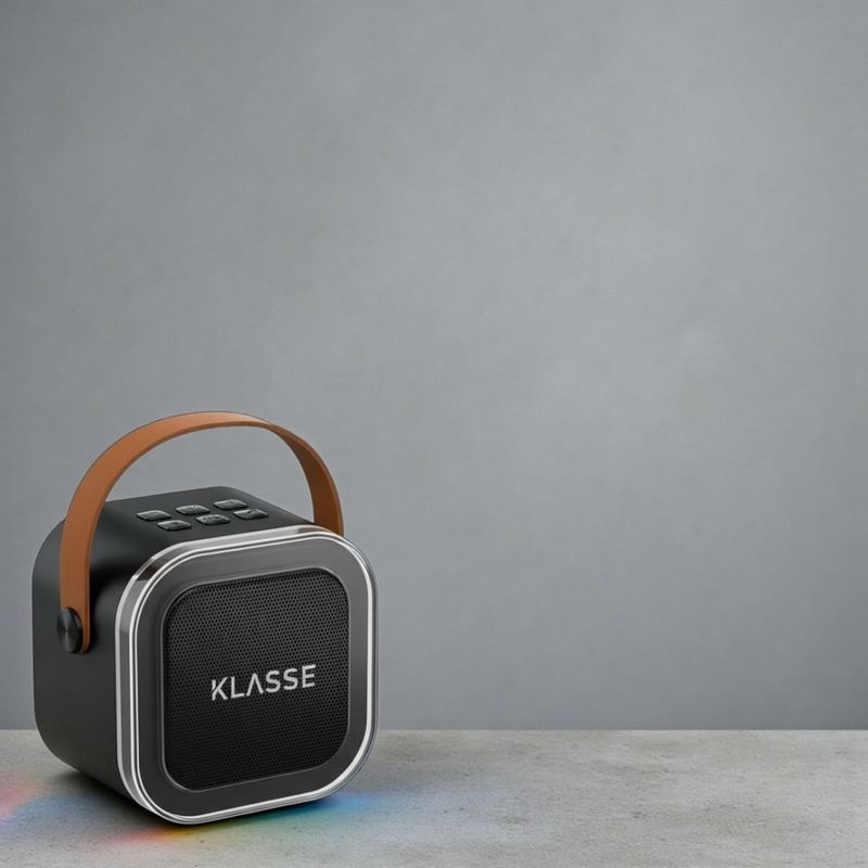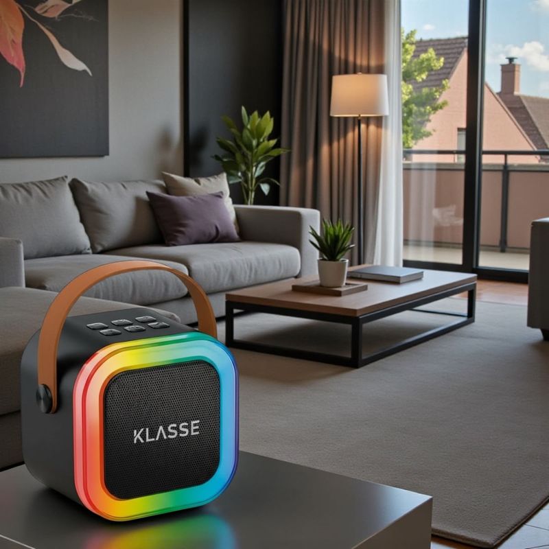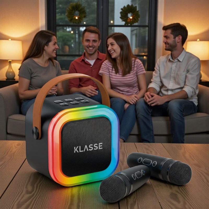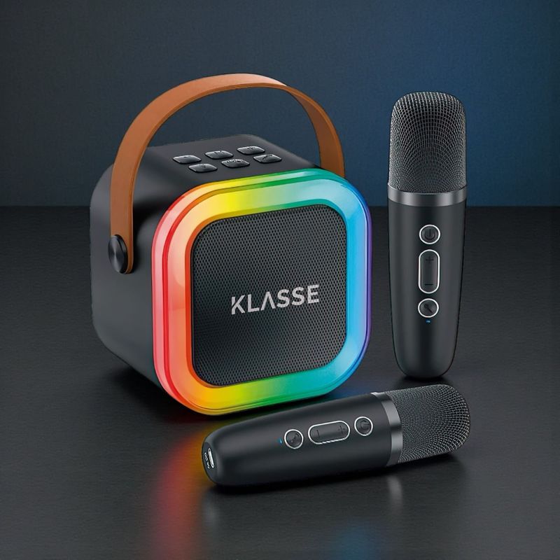 El Parlante Inalámbrico Bluetooth LED KLASSE transforma cualquier ambiente según tu estilo y tu momento. Cuando querés divertirte, su sonido 5W nítido y potente, junto con sus dos micrófonos inalámbricos te invitan a armar un karaoke épico con amigos y familia. Asimismo, sus luces LED RGB crean el ambiente perfecto para animar reuniones, cumpleaños o tardes en casa.
