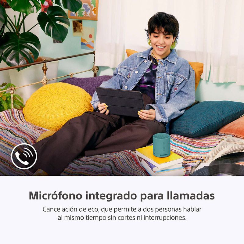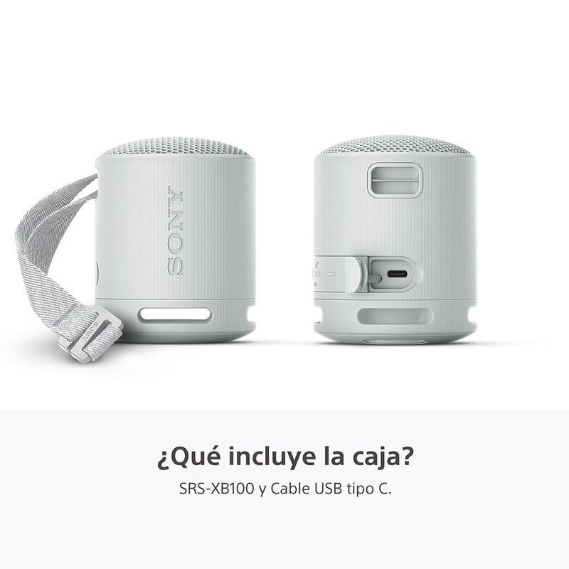 Sonido potente y nítido en un cuerpo compactoLa música es la banda sonora de nuestras vidas y queremos que seas capaz de disfrutar de tus canciones estés donde estés. Por eso, hicimos que este cuerpo portátil sea capaz de producir un sonido potente y nítido. Si te encanta la buena música y escucharla con tus amigos, el XB100 es tu compañero ideal. Radiador pasivo para un sonido potenteUn radiador pasivo funciona con un parlante de gama amplia para optimizar los tonos bajos y potenciar los graves. La nitidez está garantizada gracias al diafragma descentradoEl diseño descentrado y el equilibrio optimizado del peso consiguen un sonido más nítido incluso a un volumen alto.A = diafragma convencionalB = diafragma descentrado Expande el sonido con el procesador de difusión de sonidoQue su forma compacta no te engañe, este pequeño parlante proporciona un sorprendente sonido Surround. El procesador de difusión de sonido expande el sonido en cualquier lugar gracias a su tecnología DSP. Larga vida a tu músicaEl XB100 cuenta con una duración de la batería de hasta 16 horas,0 para que tus amigos y tú escuchéis música todo el día y parte de la noche. El porcentaje de batería restante se muestra con claridad en tu smartphone cuando conectas el XB100, lo que te permite saber cuándo es hora de cargarlo. Llévatelo donde quierasEl exterior resistente y la correa hacen que este parlante esté listo para casi todo. Cuélgatelo en la muñeca, en tu mochila e incluso de un árbol cuando estés tomando el sol, y el parlante orientado hacia abajo proyectará el sonido hasta donde estés. ¿Quieres usarlo fuera? No hay ningún problemaResistente al agua y al polvo con una calificación IP67,0 este parlante es tan bueno por fuera como por dentro. Llévatelo a la piscina, al río o al parque, y podrás escuchar música mientras tus amigos y tú disfrutan del sol.0 Buscamos lograr una huella medioambiental ceroInspirados por la belleza del mundo, contribuimos a preservar la Tierra, a la vez que ofrecemos una calidad de sonido y una experiencia de audio superiores. Con el objetivo de reducir a cero la huella medioambiental en todo el grupo Sony para el 2050, estamos acelerando numerosas iniciativas medioambientales. Sostenibilidad como objetivoNo solo diseñamos nuestros productos para ser elegantes, sino también para respetar el medioambiente. En el cuerpo y la correa multiposición del SRS-XB100, se utilizan materiales plásticos reciclados. No se emplea plástico en el material de embalaje. Estos elementos reflejan nuestro compromiso por reducir el impacto medioambiental de nuestros productos y prácticas. Llamadas de mayor calidad con Cancelación de eco¿Necesitas hacer una llamada? No hay problema. Estés en casa o fuera, el micrófono integrado te permite disfrutar de llamadas con manos libres directamente desde el parlante. Y puedes disfrutar de llamadas mejores y más nítidas gracias a la Cancelación de eco, que permite a dos personas hablar a la vez sin que ninguna se anteponga a la otra. Añade otro parlante para lograr un sonido estéreoSi quieres aumentar aún más el sonido, conecta dos parlantes XB100 sin cables para conseguir un sonido estéreo que se propague más.00 Puerto USB Type-C®Puedes cargar el XB100 a través del puerto USB Type-C®. Conexión Bluetooth® y Fast Pair0Con un toque, el parlante XB100 de Sony se empareja por Bluetooth® sin esfuerzo con tus dispositivos Android™.