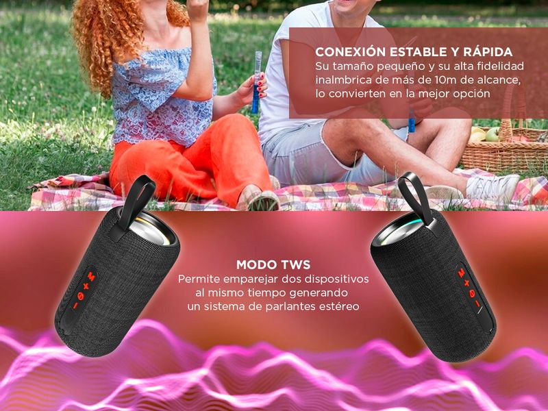 La tecnología TWS permite conectar dos parlantes de forma inalámbrica para crear un sonido estéreo inmersivo. Además, el parlante está equipado con luces RGB, añadiendo un toque visual atractivo a la experiencia auditiva.