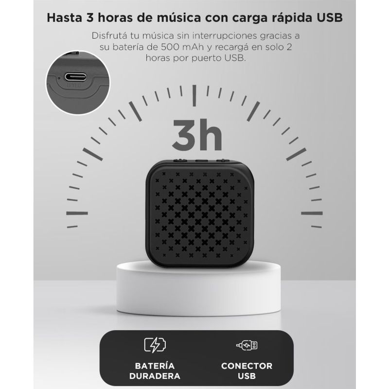 Incluye una batería recargable de 500 mAh que ofrece hasta 3 horas de reproducción continua, y se carga completamente en solo 2 horas mediante puerto USB. Perfecto para acompañarte durante el día sin interrupciones.