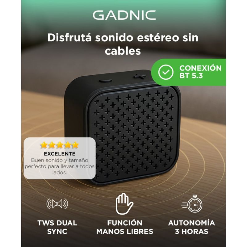 Con solo 8 cm de tamaño, el parlante Gadnic Nextbeat te acompaña a donde vayas. Su diseño resistente y liviano permite llevarlo en el bolsillo, mochila o bolso sin ocupar espacio.
