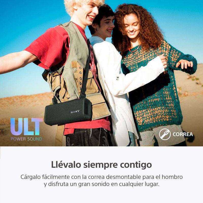 Graves potentes desde un parlante compactoSiente los graves y lleva sonidos de fiesta que aceleran el pulso donde quiera que vayas. Ya sea que estés en interiores o exteriores, obtendrás una presión de sonido y una potencia excepcionales con un parlante tan compacto. Botón ULT para potenciar los gravesPresiona el botón ULT para disfrutar de un sonido potente. Enciende ULT POWER SOUND para obtener graves mejorados. Potencia que no compromete la claridadExperimenta un sonido potente y voces nítidas gracias al diseño de controlador activo de 2 vías, que incorpora un woofer y un tweeter dedicados. Radiador pasivo lateralEl diseño de los radiadores pasivos laterales se optimizó para mejorar el sonido de los graves. Llévatelo donde quierasEste parlante compacto combina un diseño portátil con durabilidad IP66 e IP67 resistente al agua, al polvo y a golpes. Tiene una correa para el hombro desmontable para transportarlo y una duración de la batería prolongada a fin de que puedas llevar tu música a donde quiera que vayas