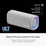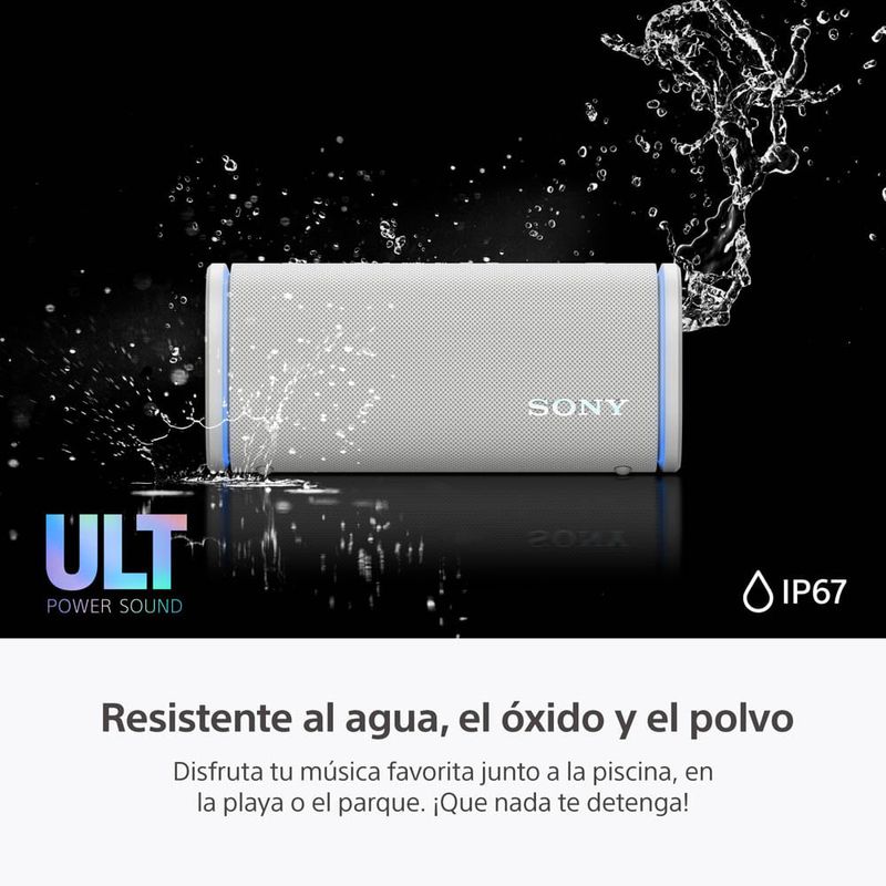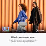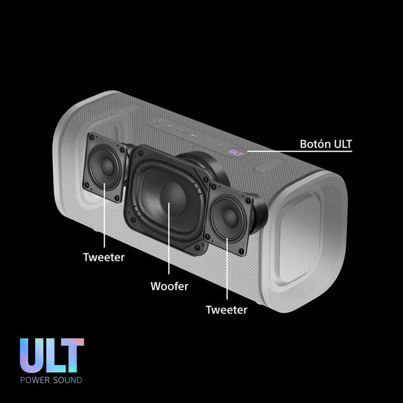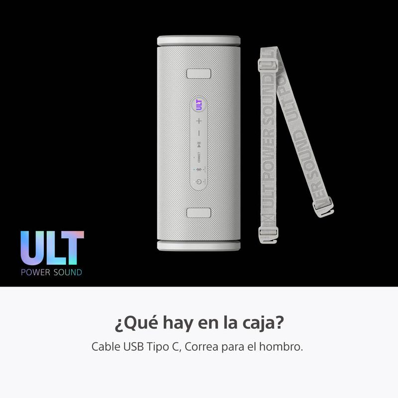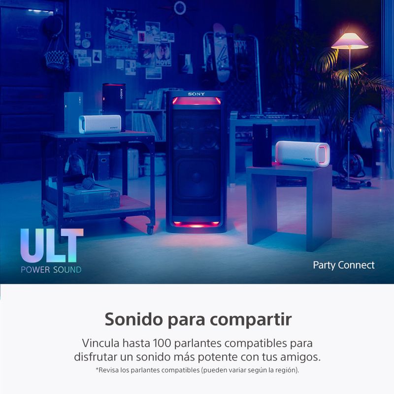 Disfruta de una experiencia musical con un sonido potente y mejoradoPrepárate para experimentar un sonido potente y mejorado con el botón ULT y activa graves más profundos que transformarán tu sonido. Sonido mejorado para sentir cada ritmoMejora los sonidos de baja frecuencia con una mayor presión de sonido y graves más profundos. Elige entre los dos tipos de potente sonido de graves, para sentir mejor cada ritmo y hacer vibrar tu pulso, con frecuencias más bajas de lo que puedes imaginar en un parlante tan compacto. Lleva una atmósfera especial a todos los espacios, profundiza tu experiencia musical y haz que todos los lugares se sientan como una fiesta. Aprieta el botón. Siente los graves.Presiona el botón ULT para disfrutar del potente sonido de ULT1 y ULT2. Selecciona ULT1 para obtener graves más profundos y de menor frecuencia. Selecciona ULT2 para obtener unos graves potentes y contundentes1. Escucha alto y claroLa tecnología del ULT FIELD 5 funciona en armonía para mejorar la calidad de sonido. La X-Balanced Speaker Unit ofrece graves profundos y contundentes y voces nítidas incluso en volúmenes altos. Un tweeter de alta eficiencia proporciona un sonido nítido y espacioso para frecuencias altas. Y los radiadores pasivos están optimizados para la extensión de graves increíbles y un sonido sin distorsiones. Todo en conjunto te ofrece un sonido excelente que merece la pena compartir con tus amigos. Sonido potente con X-Balanced Speaker Unit Nuestra X-Balanced Speaker Unit cuenta con un diafragma no circular que crea una mayor superficie en comparación con las unidades de parlante convencionales. La gran unidad de woofer de aproximadamente 79 mm x 107 mm crea un sonido de graves profundos y claros. Una experiencia más nítida, clara y profunda El diafragma no circular no solo maximiza el área del diafragma del parlante, sino que también aumenta la presión sonora para producir graves más profundos e intensos, menos distorsión y mayor claridad vocal. Todo junto, potencia tu experiencia de sonido. Una experiencia musical con enfatización de graves profundos y potentes, para disfrutar en todos ladosPuedes llevar este parlante a todos lados sin preocuparte gracias a la correa para el hombro, la duración de la batería y las características de durabilidad, como la resistencia al agua, el polvo y el óxido. Es fácil llevar la música contigoLa correa para el hombro