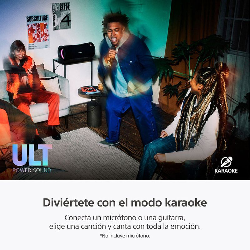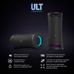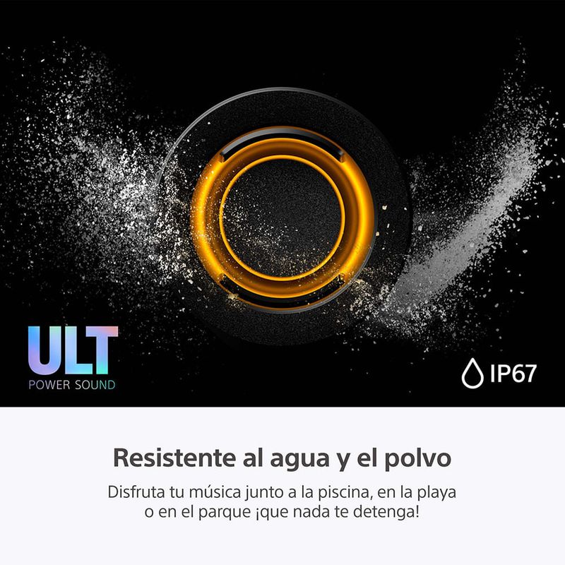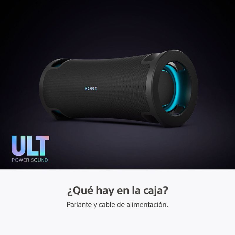 Potencia el sonido para mejorar tu músicaMejora tus frecuencias bajas para obtener graves excepcionales y siente la potencia del sonido. Bajos potentes para sentir el ritmo y hacerte bailar. Gran realce de graves para tener un sonido de baja frecuencia que hará vibrar tu corazón. Sumérgete en un sonido potente y siente la energía de una sala de conciertos en vivo en cualquier lugar. Aprieta el botón. Siente los graves.Presiona el botón ULT para disfrutar del sonido potente de ULT1 y ULT2. Selecciona ULT1 para obtener graves más profundos y de menor frecuencia. Selecciona ULT2 para obtener unos graves potentes y contundentes. Escucha alto y claroLa tecnología del ULT FIELD 7 funciona en armonía para mejorar la calidad de sonido. La X-Balanced Speaker Unit ofrece graves profundos y potentes, y voces claras incluso con un volumen alto. Un tweeter de alta eficiencia proporciona un sonido nítido y espacioso para frecuencias altas. Los radiadores pasivos optimizan el sonido para mejorar los graves nítidos. Todo en conjunto te ofrece un sonido excelente que merece la pena compartir con tus amigos. Sonido potente con X-Balanced Speaker UnitNuestro X-Balanced Speaker Unit cuenta con un diafragma casi rectangular que crea una mayor superficie en comparación con las unidades de parlante convencionales. La gran unidad de woofer de aproximadamente 114 x 114 mm crea un sonido de graves profundos y claros. Una experiencia más nítida, clara y profundaEl diafragma no circular no solo maximiza el área del diafragma del parlante, sino que también aumenta la presión sonora para producir graves más profundos e intensos, menos distorsión y mayor claridad vocal. Para disfrutar de una experiencia de audio más intensa, clara y satisfactoria. Llévalo a cualquier lugar, por más tiempoDisfruta de tu fiesta dentro o fuera con un diseño fácil de transportar, resistente al agua y al polvo que funciona horizontal o verticalmente, alimentado por una batería que dura más. Tu música con un asaCon su asa cómoda y elegante, el ULT FIELD 7 está diseñado para acompañarte a donde quieras llevar tu música. Llévalo al exteriorCon una clasificación IP67 resistente al agua y el polvo