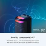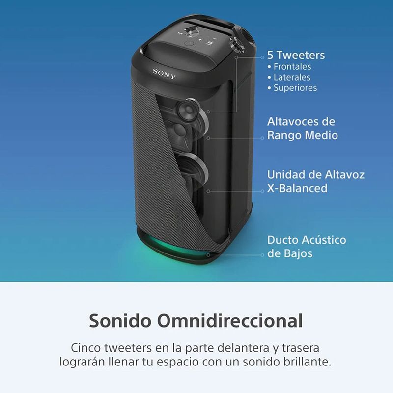 Sonido de Fiesta Omnidireccional: El sonido potente se propaga por todos los rincones de la sala. Cuenta con cinco tweeters (tres frontales de 60 mm y dos posteriores de 40 mm) para un sonido de alta frecuencia nítido alrededor del parlante.