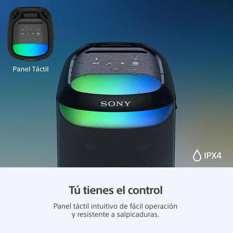 El Sony SRS-XV800 es tu aliado perfecto para cualquier reunión, ofreciendo sonido de alta calidad desde cualquier posición, una batería que nunca te deja a pie y la flexibilidad de ser un amplificador de TV, karaoke y cargador portátil. ¡Llevá la fiesta contigo y no te preocupes por las salpicaduras!