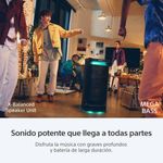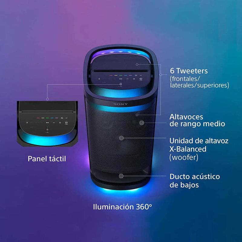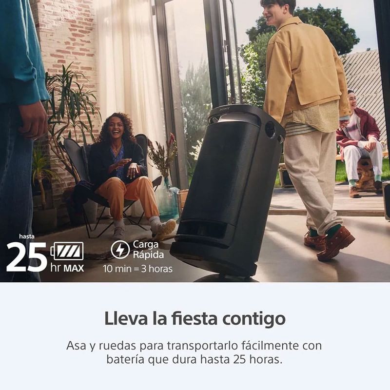 El Parlante Portátil Sony SRS-XV900 es un centro de fiesta de alta potencia diseñado para llevar la experiencia de un concierto a cualquier lugar, dentro o fuera de casa. Combina un Sonido de fiesta omnidireccional con una batería de larga duración, múltiples opciones de conectividad y funciones avanzadas como el Refuerzo de sonido de TV.