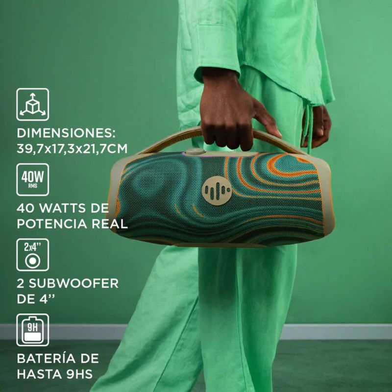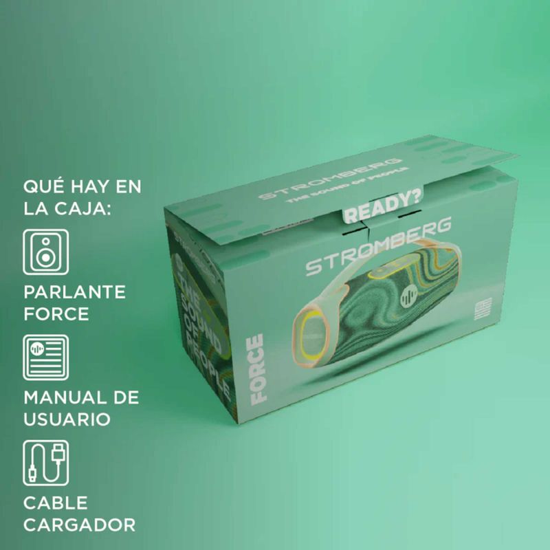 El Stromberg Force Boombox es un parlante robusto de 40 W RMS con dobles woofers de 4″, batería con autonomía de hasta 9 horas, conectividad Bluetooth, entradas AUX de 3,5 mm y 6,3 mm (ideal para micrófono o guitarra), luces RGB integradas para ambientación, y certificación IPX4 para resistencia a salpicaduras — una combinación de potencia, estilo y funcionalidad para llevar tu música donde quieras.