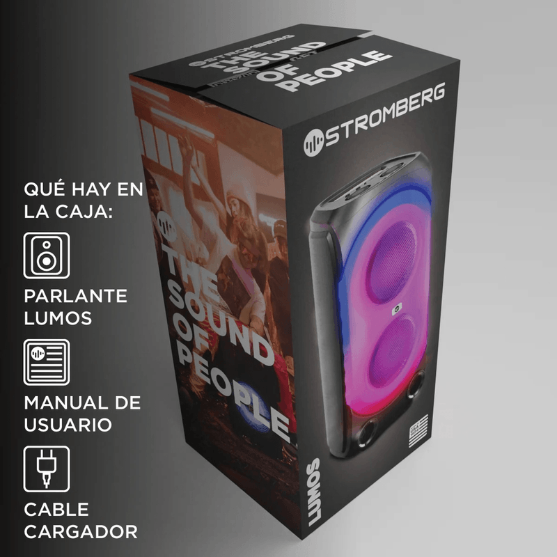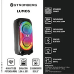 DescripcinCon el parlante porttil Stromberg Lumos la msica se convierte en la gua de tus fiestas creando un ambiente lleno de energa y vibraciones positivas. Con sus 2 woofers de 6.5 pulgadas y una potencia de 40 Watts transforma cada reunin en un evento inolvidable.El parlante Stromberg Lumos con bluetooth entrada auxiliar y micrfono se adapta a tus necesidades. Con una duracin de batera de 4 horas ser tu aliado en cada celebracin. Ya sea en casa en el jardn o en una aventura espontnea el parlante Stromberg Lumos siempre te acompaa.Conectalo a travs de Stromberg Connect con otro parlante de la misma familia y crea un efecto estreo donde cada acorde cobre vida.Tipo InalmbricoConexiones Auxiliar - BluetoothBluetooth SiControl Remoto NoEntrada Mic SiCantidad de Parlantes 2Tamao de Subwoofer 6Control Remoto NoAlto cm 56Ancho cm 27Profundidad cm 22Peso kg 4