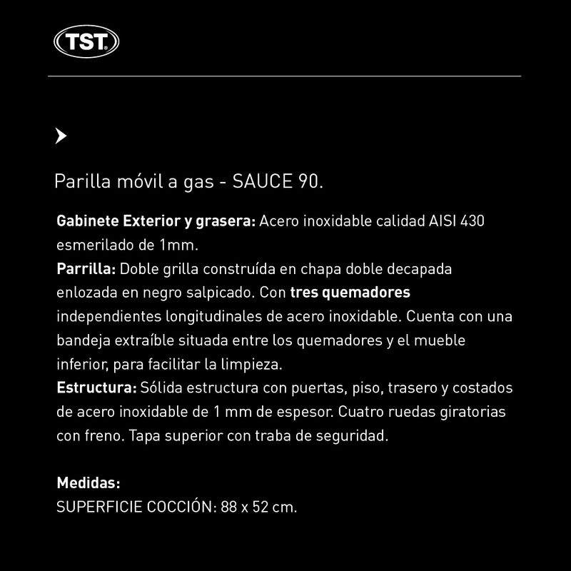 La Parrilla TST Sauce 90 está pensada para quienes buscan mayor superficie de cocción, potencia y practicidad al momento de asar. Ideal para uso hogareño en exteriores, permite preparar grandes cantidades de comida de manera cómoda, con control eficiente del fuego a gas y resultados parejos en cada cocción. Su diseño robusto y funcional la convierte en una excelente opción para patios, quinchos y reuniones numerosas.