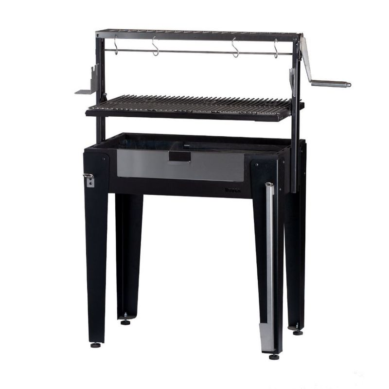 » Especificaciones: Material: Acero / Acero inoxidableAncho: 75.8 cmAlto: 113 cmProfundidad: 43.8 cmPeso: 27 kgCapacidad de Rejillas: 3 RejillasAccesorios: Atizador, destapador y ganchosBase de spiedo: Si (Spiedo 90cm.)Compatibilidad: Módulo rejilla en V Blockgrill
