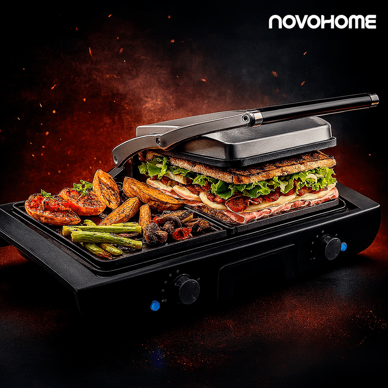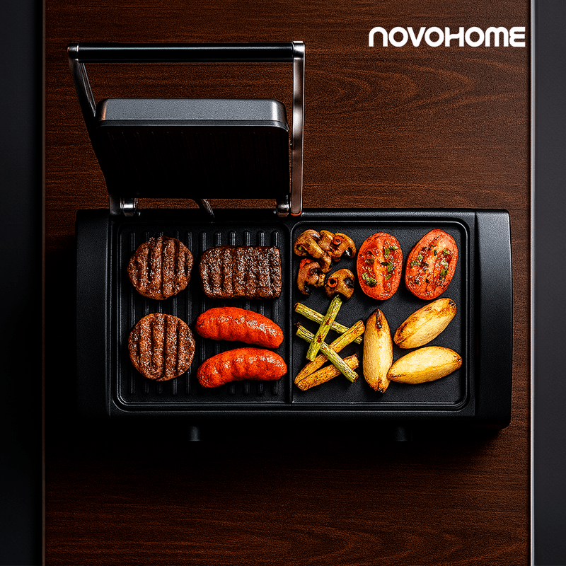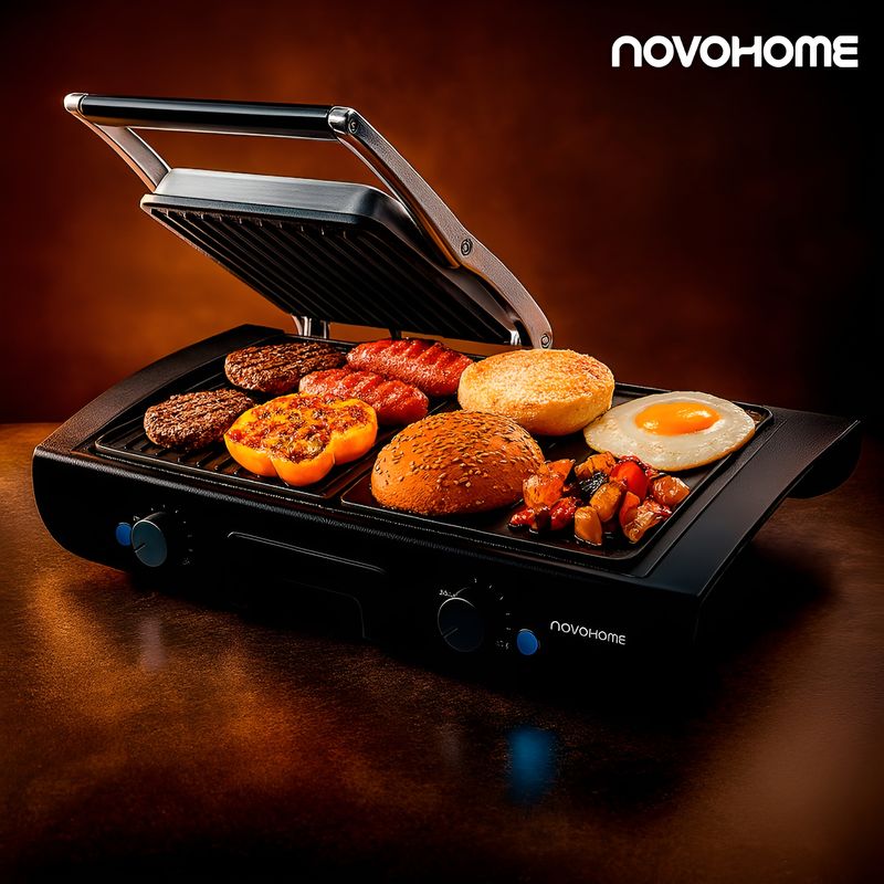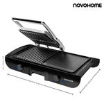NOVOHOME PARRILLA GRILL CON TAPA PRENSA Y PLANCHETA BIFERA 1500W