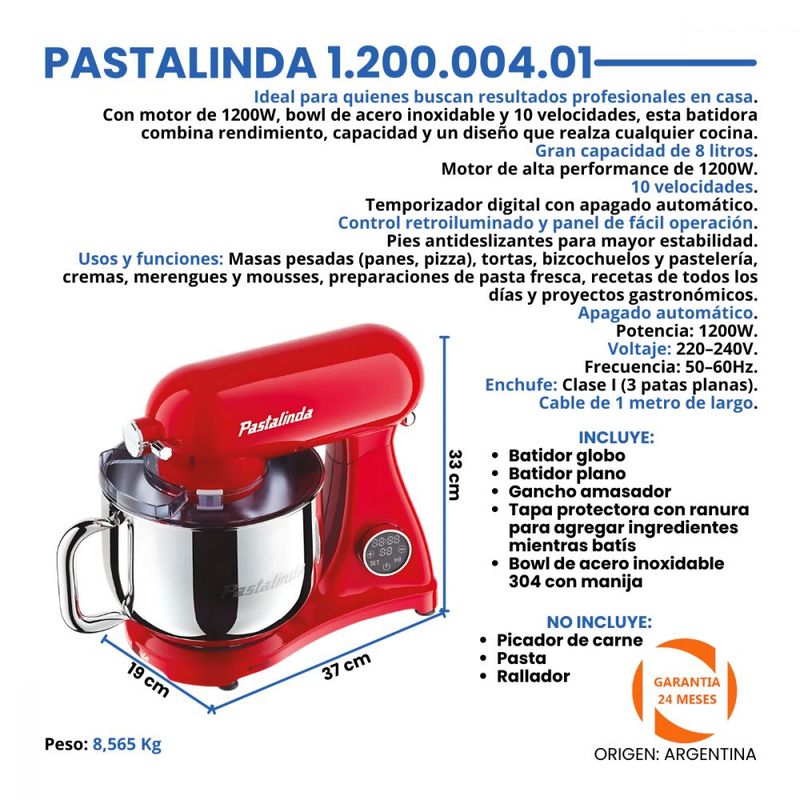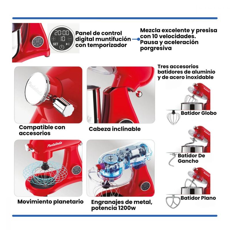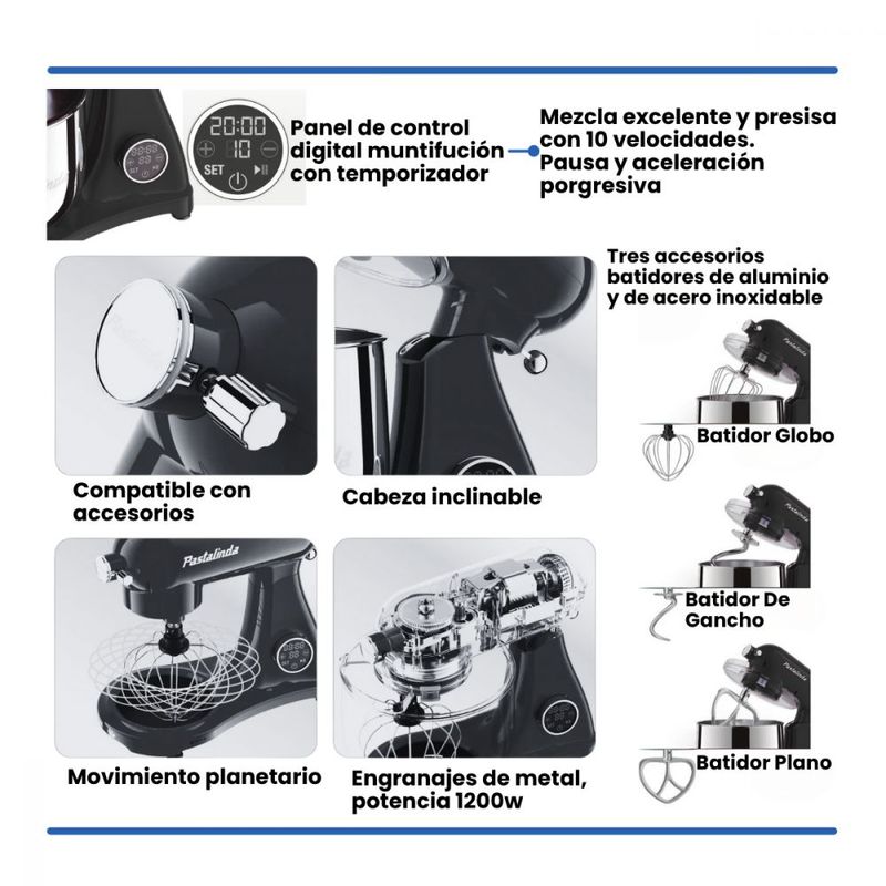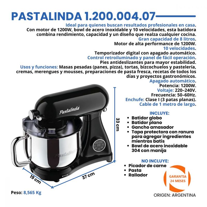 Con motor de 1200W, bowl de acero inoxidable y 10 velocidades, esta batidora combina rendimiento, capacidad y un diseño que realza cualquier cocina.