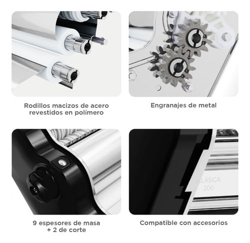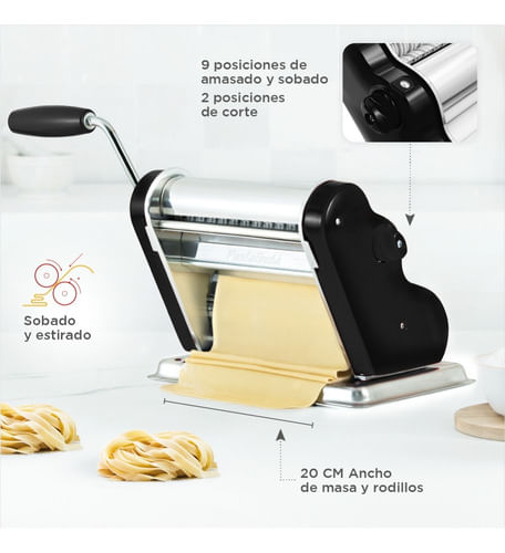 Amasa y estira todo tipo de pasta, desde deliciosos tallarines y espaguetis hasta hojas de masa para lasañas, canelones, ravioles, sorrentinos, cappelettis, pappardelle y una amplia variedad de pastas laminadas que puedas imaginar.