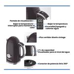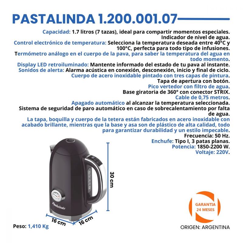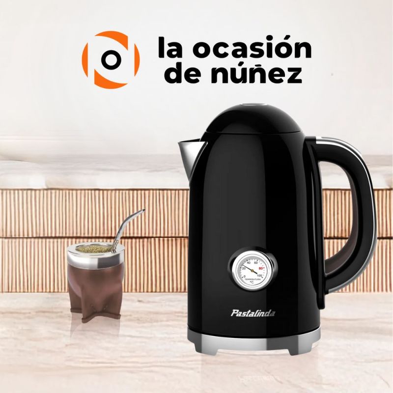 Termómetro análogo en el cuerpo de la pava, para saber la temperatura del agua en todo momento.