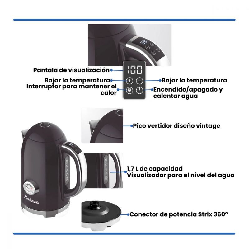 Control electrónico de temperatura: Selecciona la temperatura deseada entre 40°C y 100°C, perfecta para todo tipo de infusiones.