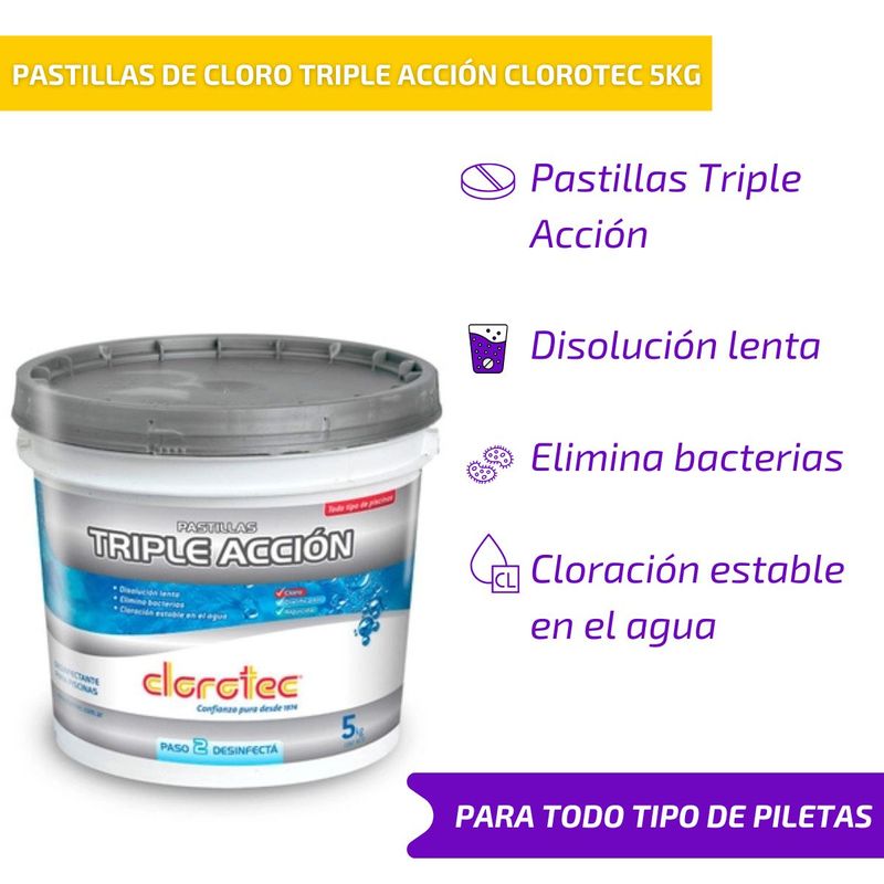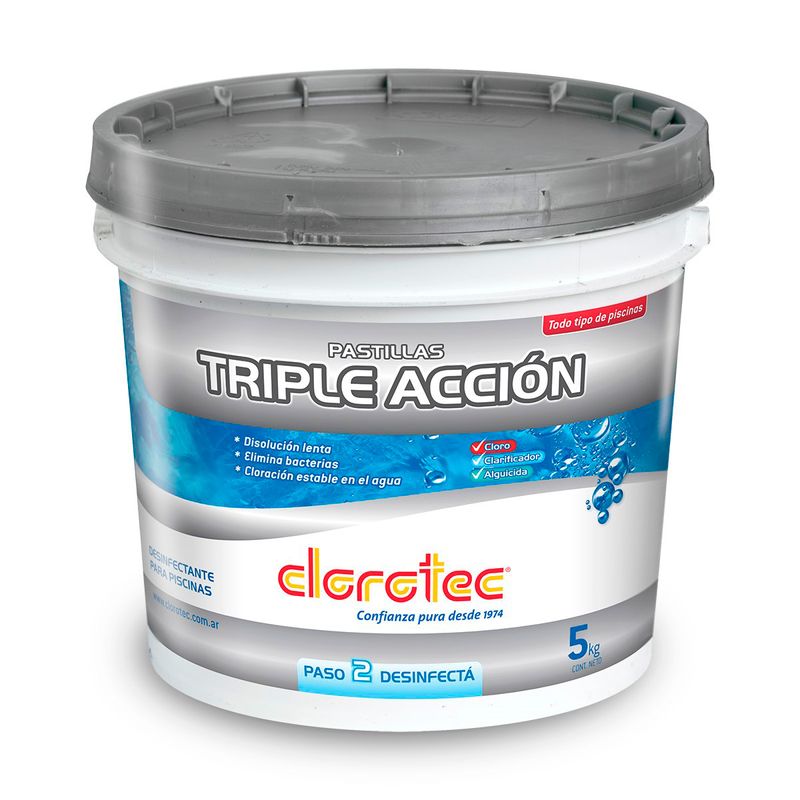 1- La dosis de cloración es una (1) Pastilla Triple Acción Clorotec de 200g para 15m3 (15.000 litros) de agua.