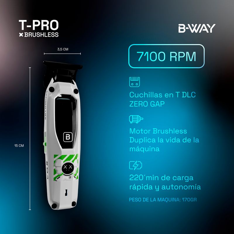 Patillera profesional inalambrica BWAY equipada con motor Brushless de 7100 rpm y 5 W de potencia para cortes precisos rapidos y sin esfuerzo. Cuchillas Skeleton DLC ajustables a ZERO GAP y cuchilla en T DLC 3 0 para lograr detalles nitidos lineas definidas y cortes al ras. Sistema de proteccion con retardo de 2 segundos para mayor seguridad y duracion. Bateria de iones de litio de 1800 mAh con hasta 180 minutos de uso continuo y carga completa en 3 horas. Luz LED indicadora de energia para control total. Incluye patillera aceite lubricante cepillo de limpieza cable USB de carga y herramienta de calibracion ZERO GAP. Beneficios herramienta premium para barberos exigentes precisa y versatil ideal para acabados profesionales. Garantia oficial de 6 meses y servicio tecnico especializado con repuestos originales