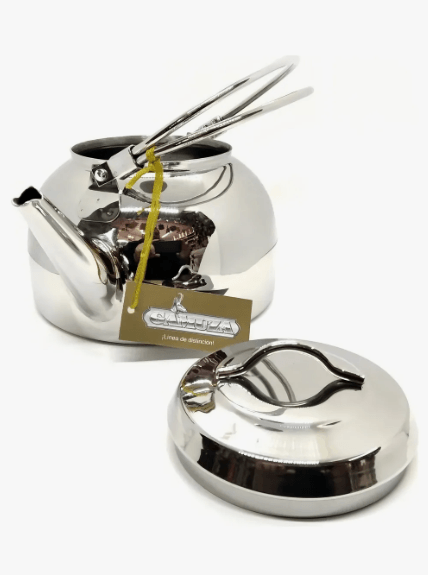 Su diseño funcional incluye un mango y pomo de acero inoxidable que le confieren una estética de línea profesional (a diferencia de otros modelos con baquelita o madera). El pico recto está pensado para un vertido preciso, ideal para cebar mate sin derrames.