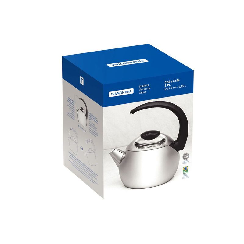 Para aquellos que les gusta la elegancia y la seguridad, la tetera de acero inoxidable con mango negro 14,5 cm de diámetro y 2,25 l Tramontina es la mejor elección. Posee un diseño encantador, está hecha de acero inoxidable con terminación en alto brillo, un mango de material especial que no deja pasar el calor y una tapa que evita que el líquido se derrame. ¡Muchas ventajas en un solo producto, su cocina necesita de esta maravillosa pieza!
