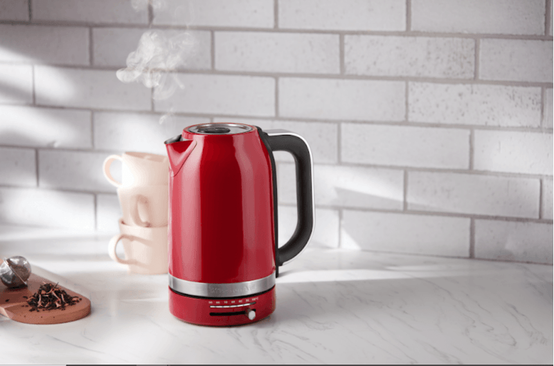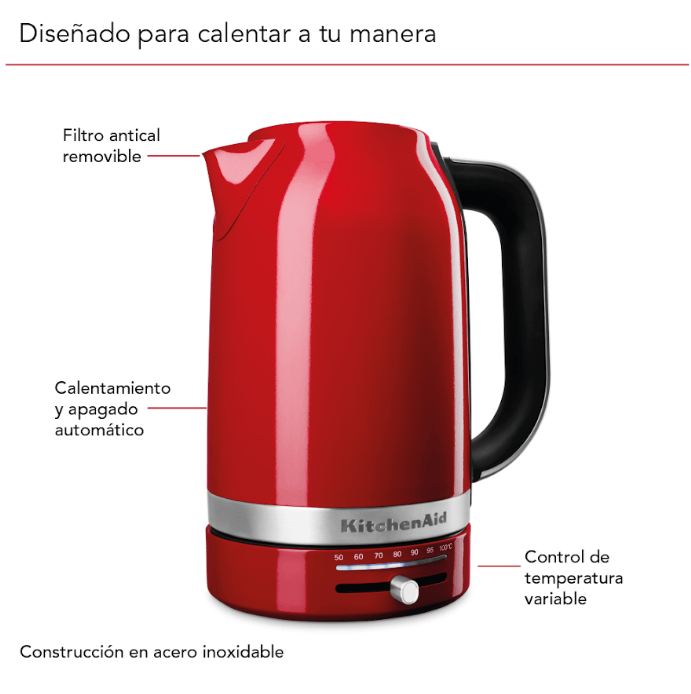 Disfruta de tus desayunos con esta pava KitchenAid® de 1,7 litros, ideal para preparar una o varias raciones de té, café, cereales y mucho más. Esta pava cuenta con tecnología de calentamiento automático, que se encarga de hervir el agua y se apaga automáticamente una vez finalizada la ebullición. También dispone de control de temperatura variable, para hervir rápida y silenciosamente a la temperatura que necesites. La base giratoria desmontable te permite desplazarte libremente con tu pava al lugar que te resulte más cómodo.