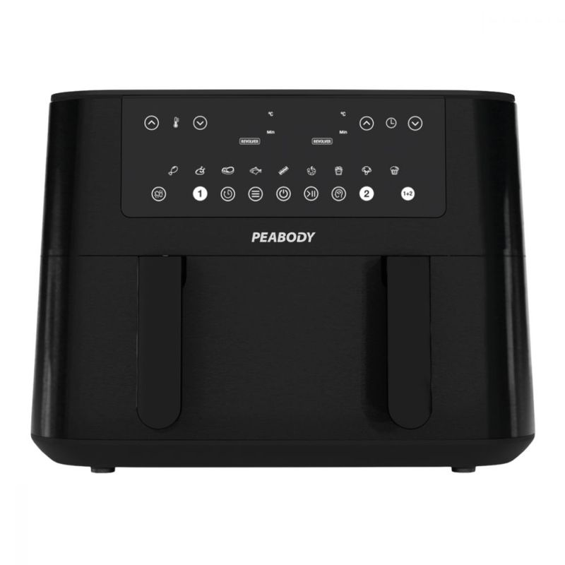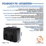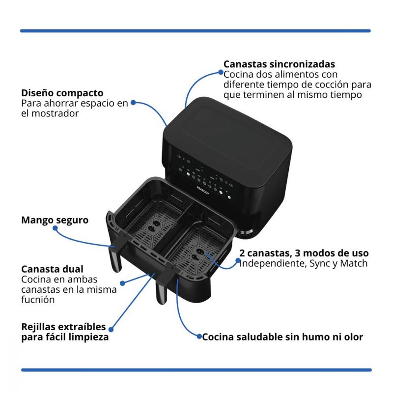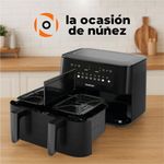 2 canastas freidoras independientes de 9 L, que permite separar el compartimento en dos de 4,5 L para cocinar distintos platos sin mezclar sabores.