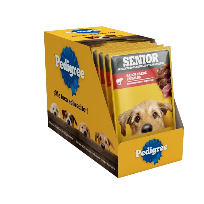 Pedigree® Sobre Senior con ingredientes naturales es alimento húmedo 100% completo y balanceado cocido al vapor, que contiene suaves trocitos en salsa y ha sido formulado para perros adultos mayores a 7 años de edad, aportando vitalidad y energía en cada porción.