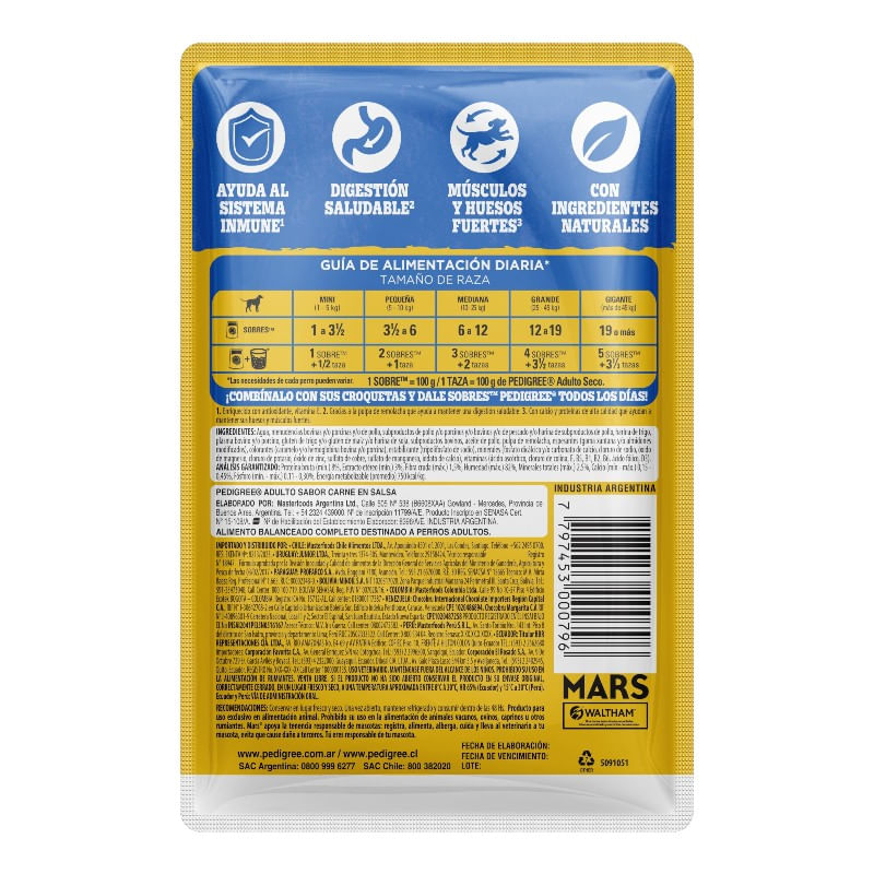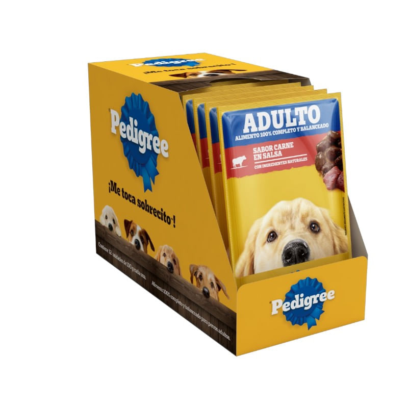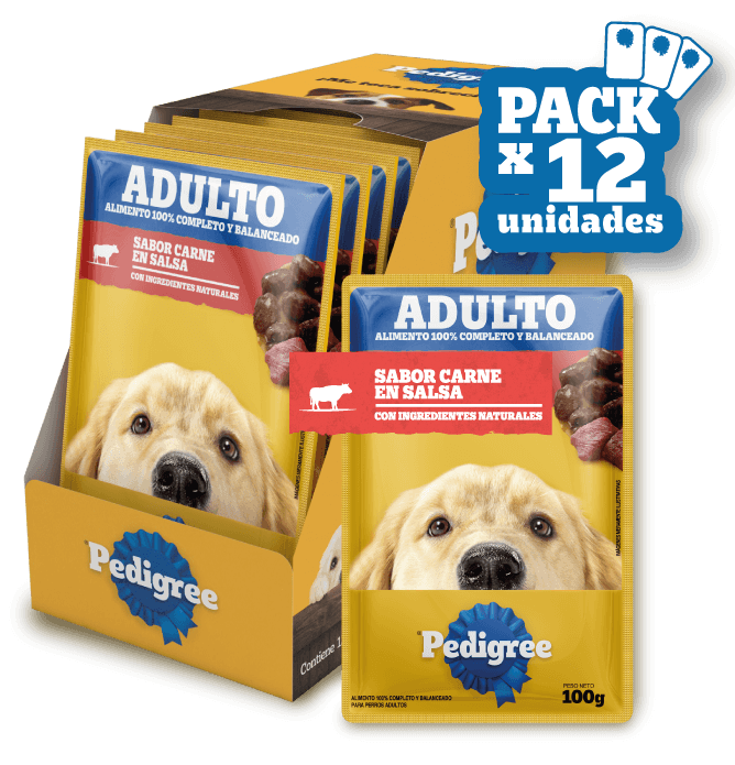 Pedigree® Sobre Adulto con ingredientes naturales es alimento húmedo 100% completo y balanceado cocido al vapor, que contiene suaves trocitos en salsa y ha sido formulado para perros adultos aportando, vitalidad y energía en cada porción.