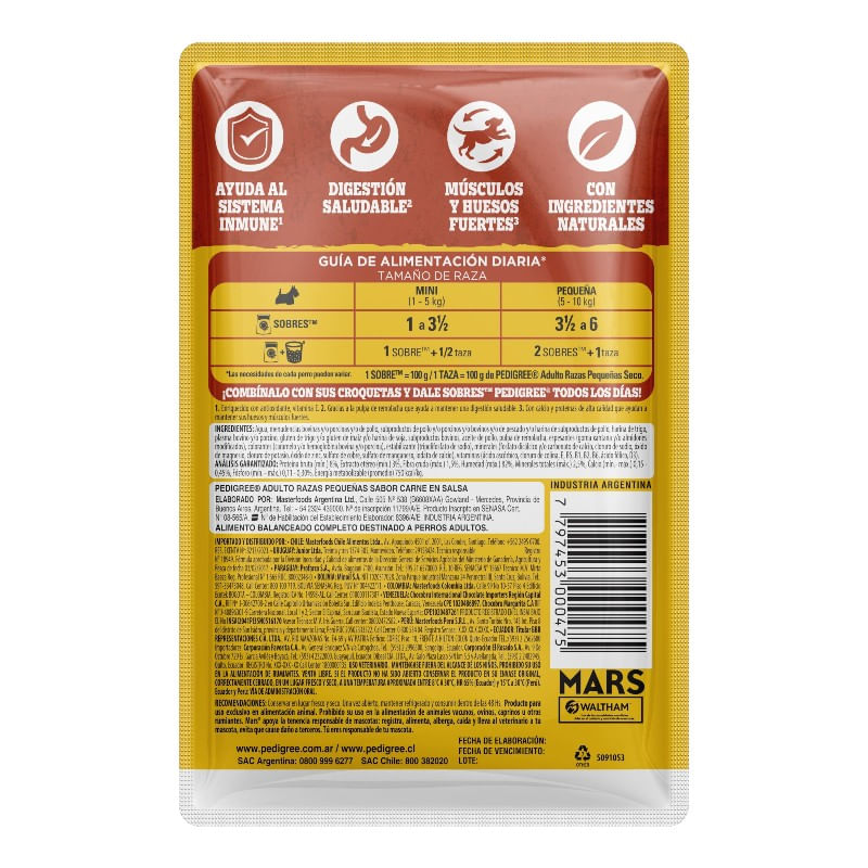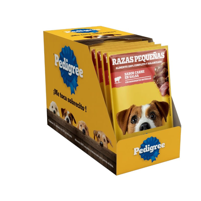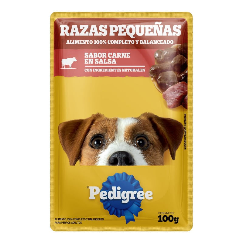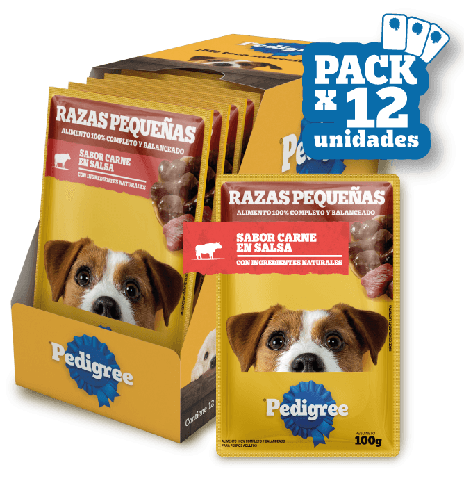 Pedigree® Sobre Adulto Razas Pequeñas con ingredientes naturales es alimento húmedo 100% completo y balanceado cocido al vapor, que contiene suaves trocitos en salsa y ha sido formulado para perros adultos de razas pequeñas aportando, vitalidad y energía en cada porción.