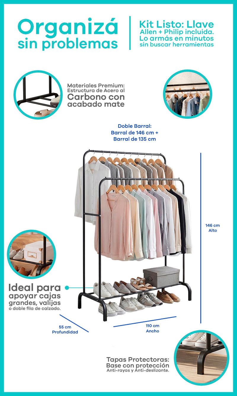 -Doble Barral: Barral de 146 cm + Barral de 135 cm. Se adapta perfectamente a todas tus prendas.