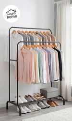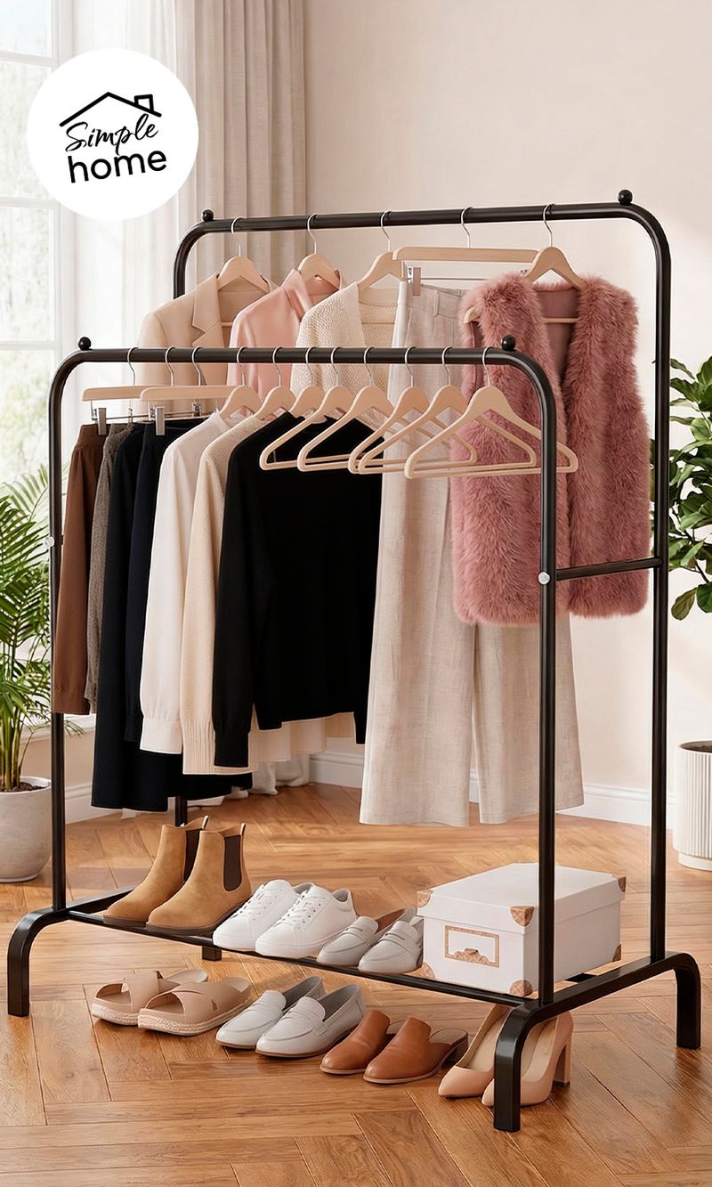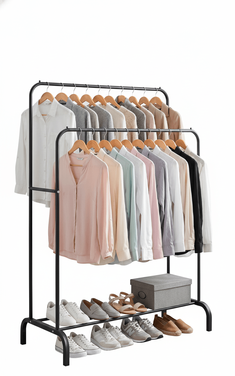 Perchero de pie Vestidor Doble Barral de Acero con base para calzados