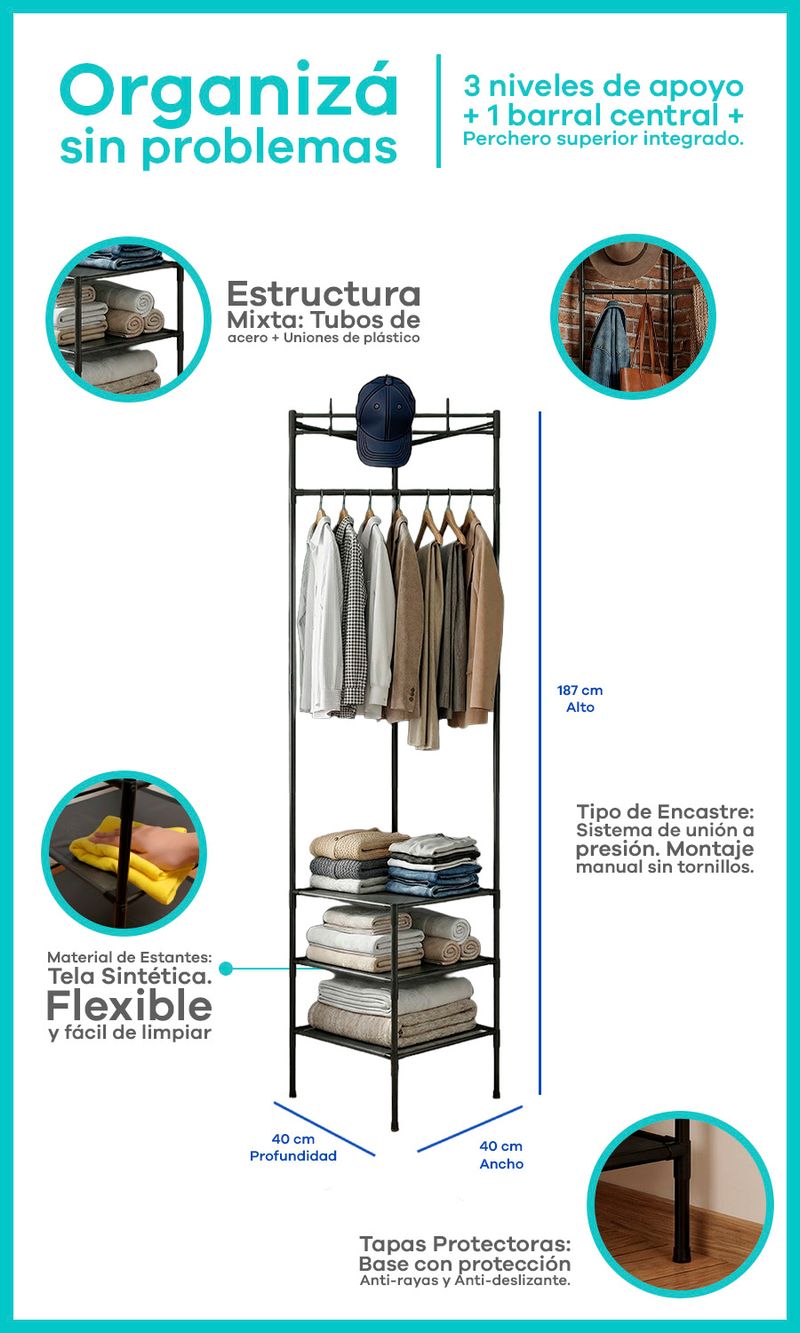 -Triple Estante Soft: 3 niveles de tela tensada ideales para apoyar ropa doblada, toallas y accesorios livianos.