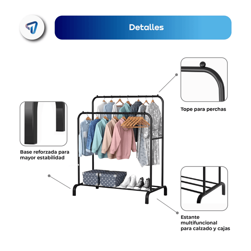 Perchero Organizador Metálico WAGGS PERE03 con doble barral, ideal para optimizar dormitorios, vestidores u oficinas con más capacidad y estilo. Su estructura de metal con acabado negro mate soporta hasta 40 kg distribuidos, ofreciendo resistencia y presencia moderna. Incluye estante inferior multiuso para calzado o accesorios y ganchos laterales para mayor organización. Con armado rápido y sin herramientas, se adapta a cualquier ambiente combinando funcionalidad, durabilidad y diseño. Medidas: 146 cm alto barral superior / 127 cm barral secundario × 112 cm ancho × 55 cm profundidad. Una solución práctica para mantener tu ropa y objetos siempre en orden.